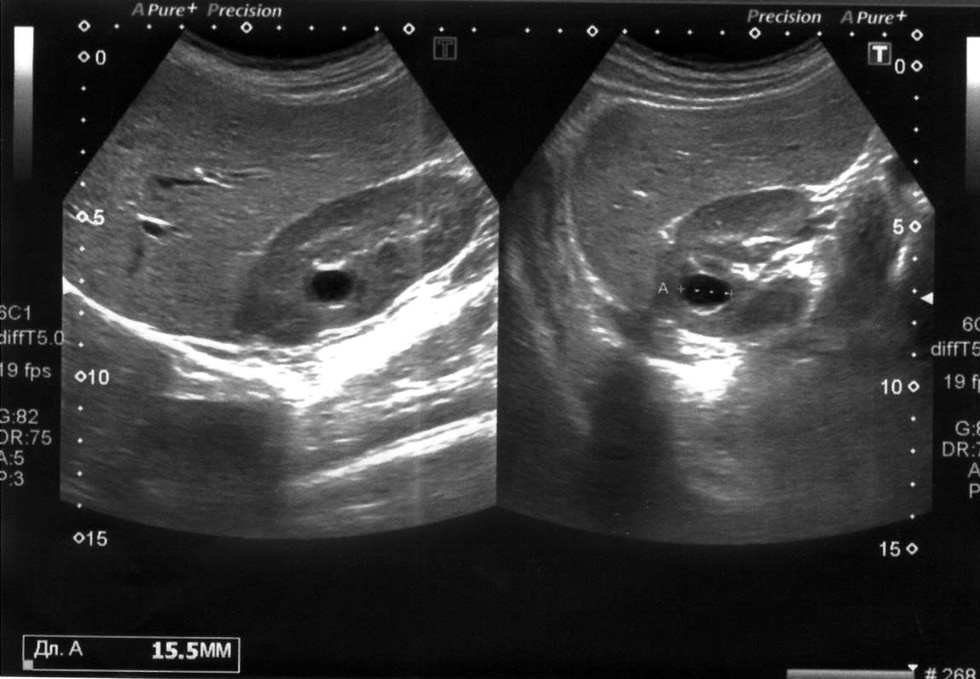 При ультразвуковом исследовании почек в среднем полюсе левой почки визуализируется анэхогенное аваскулярное образование с чёткими ровными контурами размером 15×14 мм. Заключение: Ультразвуковые признаки простой кисты левой почки (рис. 5).
