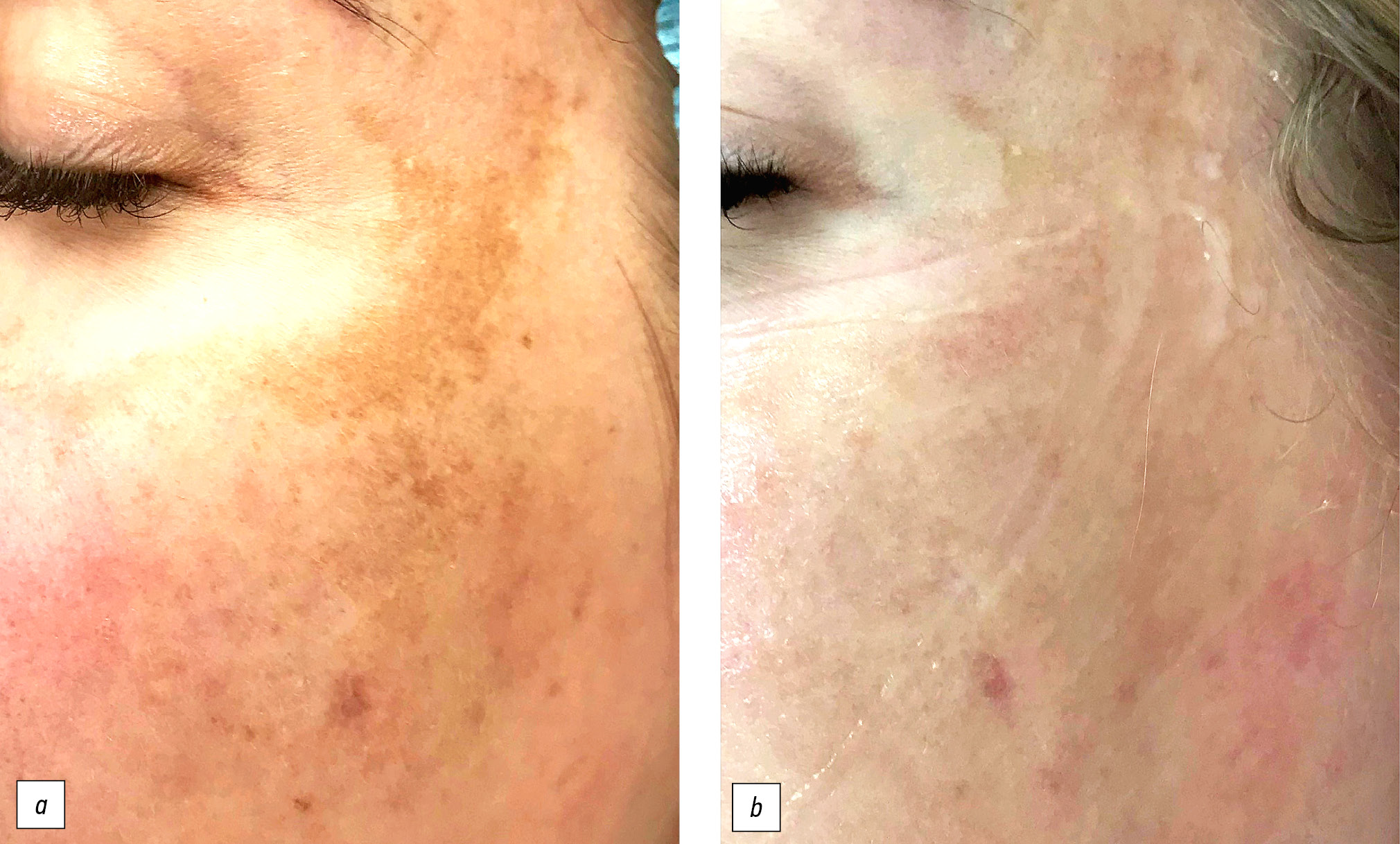 При оценке результатов проведённого исследования выявлено, что наиболее выраженная клиническая эффективность, а именно снижение степени тяжести мелазмы, уменьшение количества меланина в коже и улучшение качества жизни, наблюдалась в группе пациентов, получавших комплексное лечение мелазмы в виде назначения комбинации крема Эленеон-Н (2% гидрохинона и 0,025% третиноина) 1 раз в день на ночь и фототерапии методом IPL 1 раз в месяц в течение 3 мес (рис. 2–4).