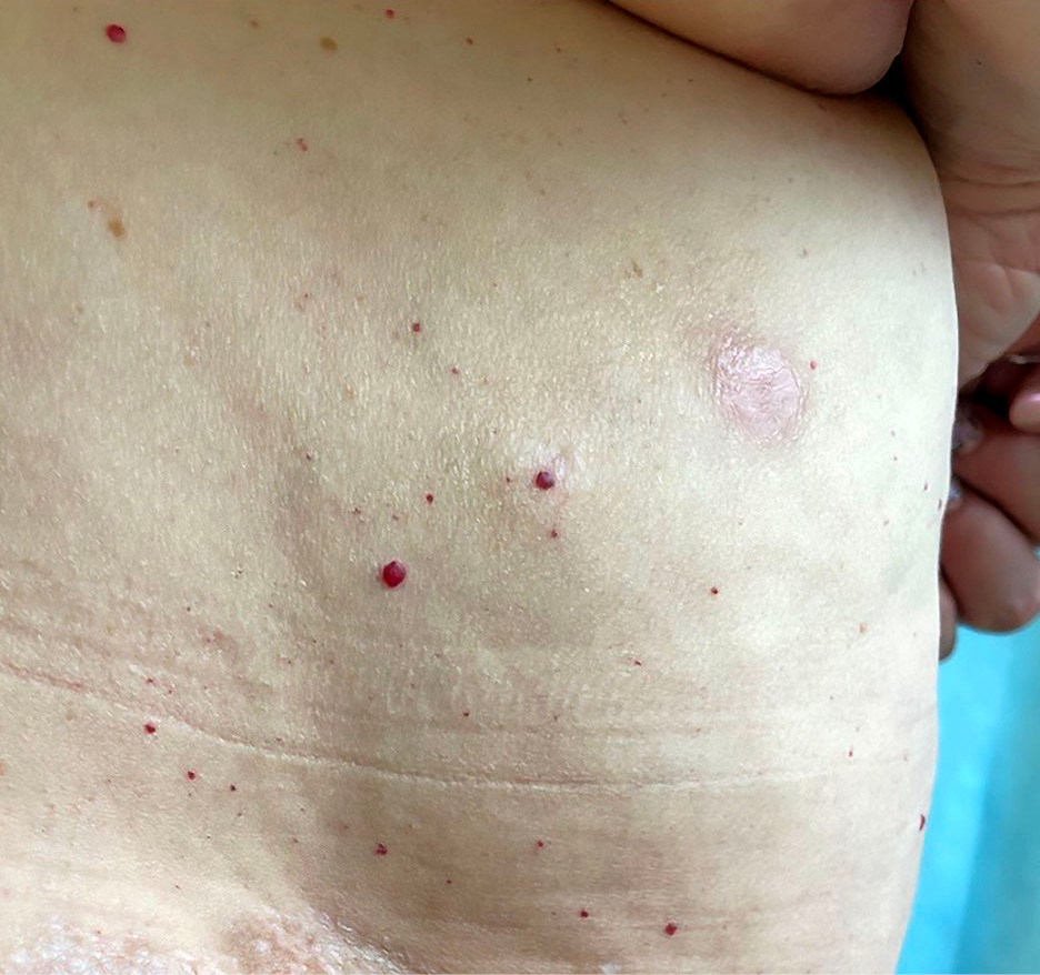 Пациентка М., 1956 года рождения, поступила в отделение дерматовенерологии ГБУЗ МО МОНИКИ с жалобами на высыпания на коже молочных желёз, в субмаммарных складках, на коже живота, поясничной области, ягодиц, наружной поверхности бёдер, сопровождающиеся периодическим незначительным зудом и чувством стягивания.