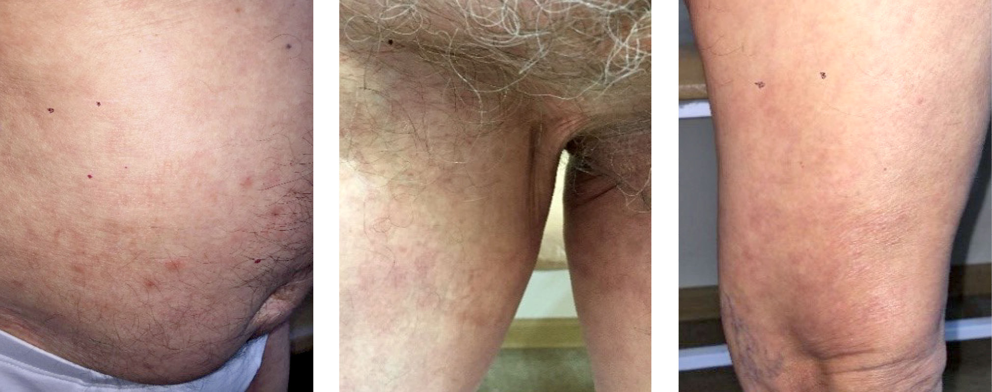 При поступлении на коже верхних конечностей, живота, боковой области спины, паховой области и нижних конечностей имеются полиморфные высыпания в виде эритематозно-сквамозных очагов от 3 до 10 см в диаметре, частично сливающиеся, с чётким периферическим валиком, состоящим из мелких папул на инфильтрированном основании. На поверхности очагов располагаются округлые папулы размером до 0,5–1 см с чёткими границами, плотноватой консистенции. Субъективно ― периодически малоинтенсивный зуд (рис. 1).