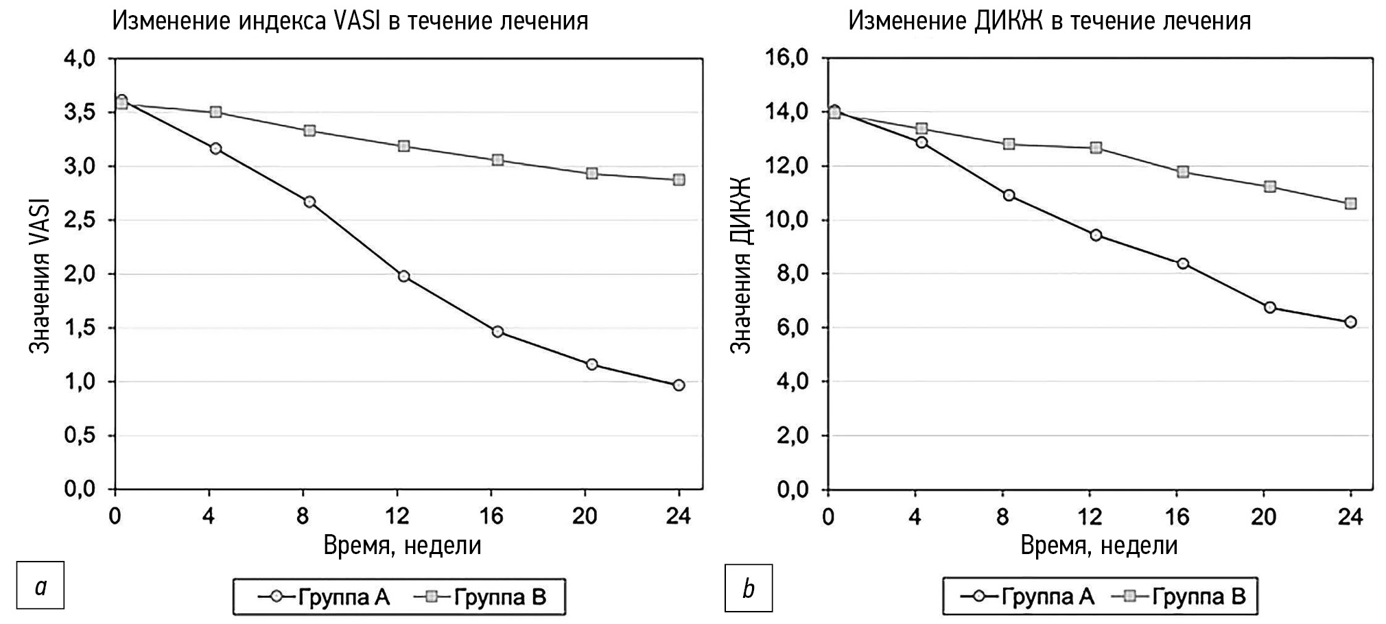 Рис. 1. Эволюция индекса распространённости и тяжести витилиго (VASI; a) и дерматологического индекса качества жизни (ДИКЖ; b) в течение всего периода исследования (24 нед).