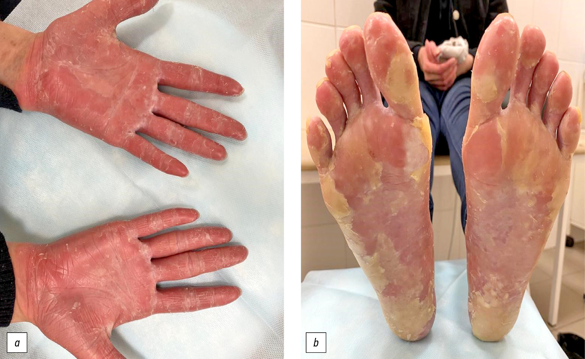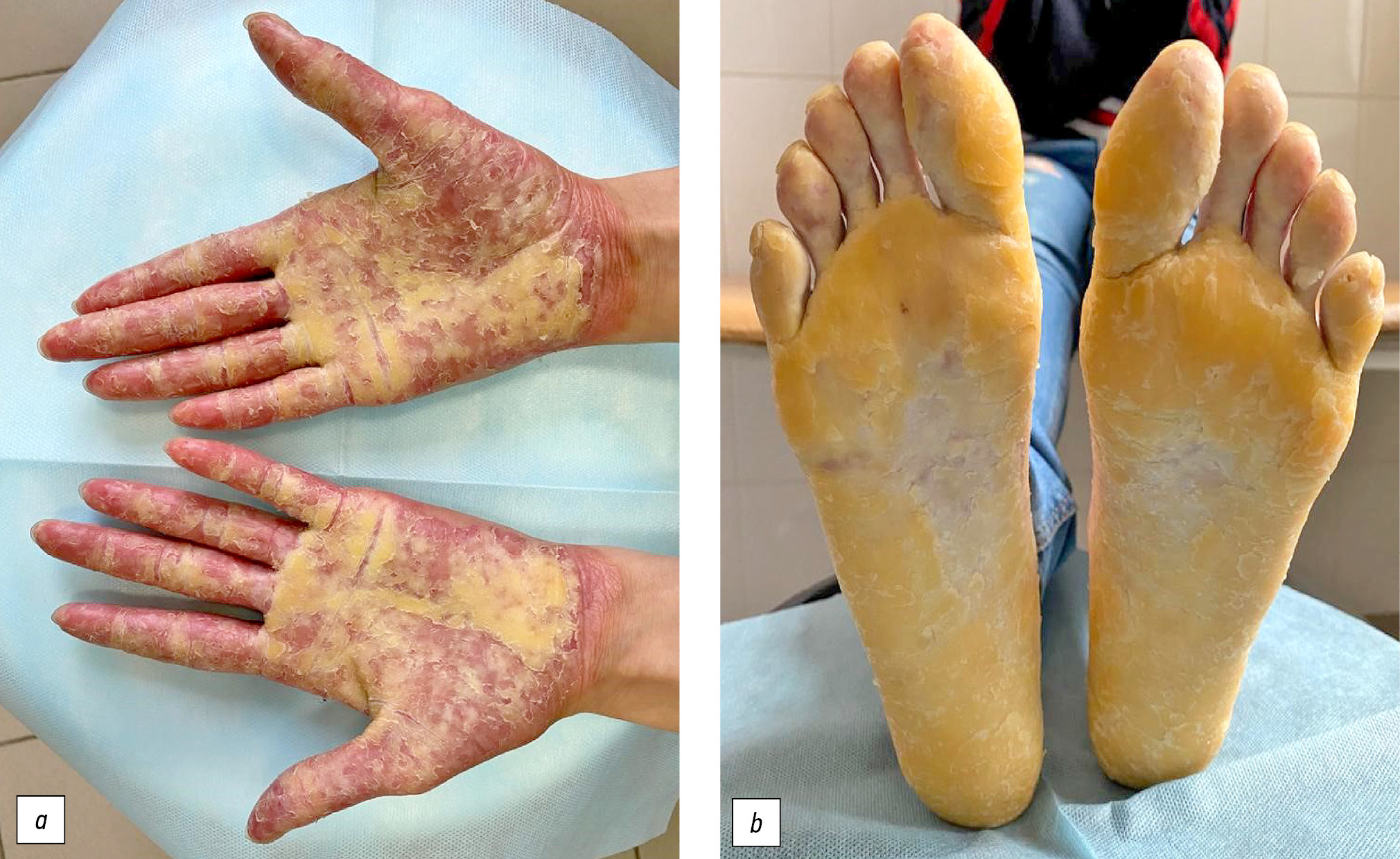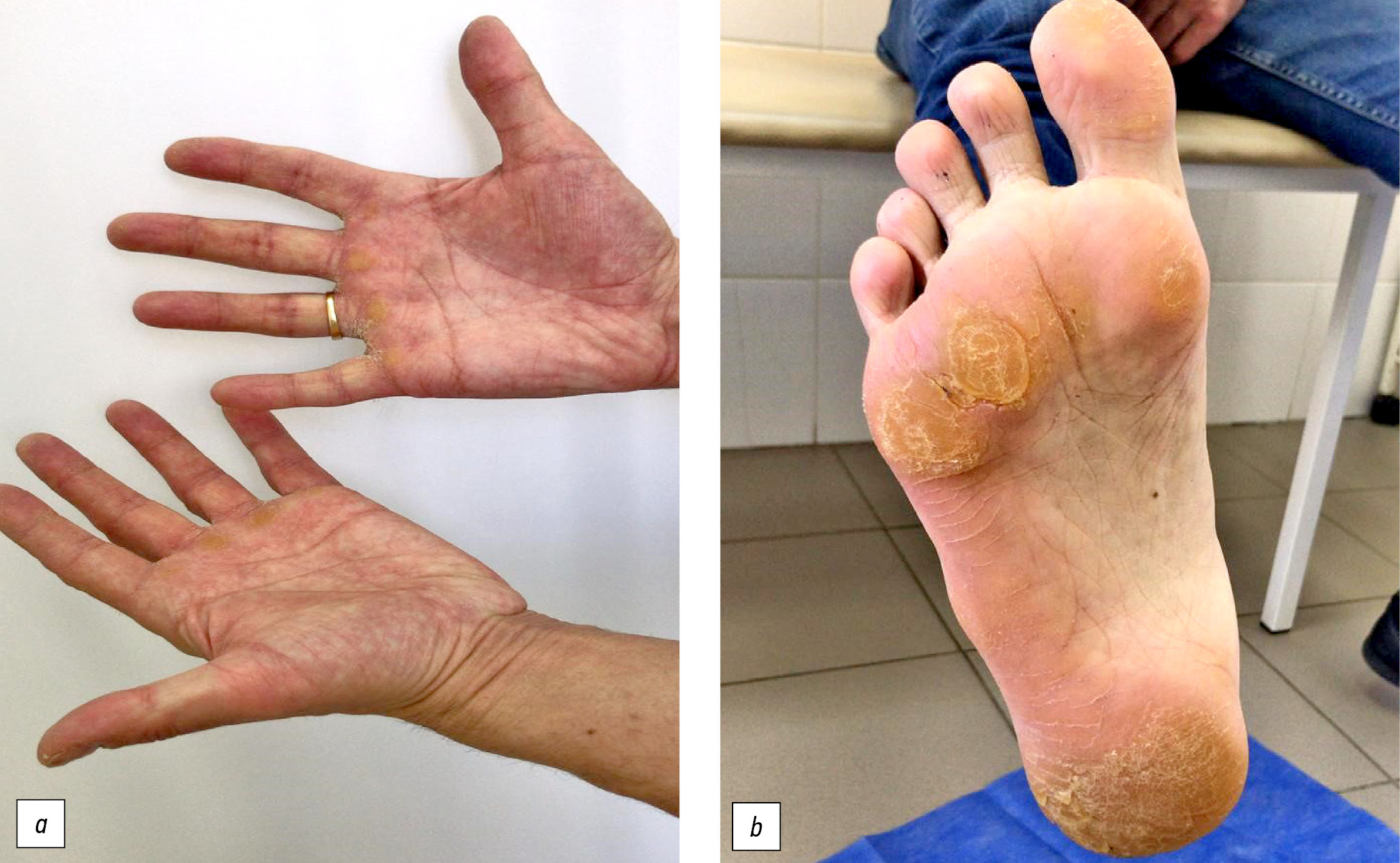 Рис. 3. Пациент З., 42 года, ладонно-подошвенная кератодермия, тип Бушке–Фишера–Брауэра: характерные проявления на коже кистей (а) и стоп (b).