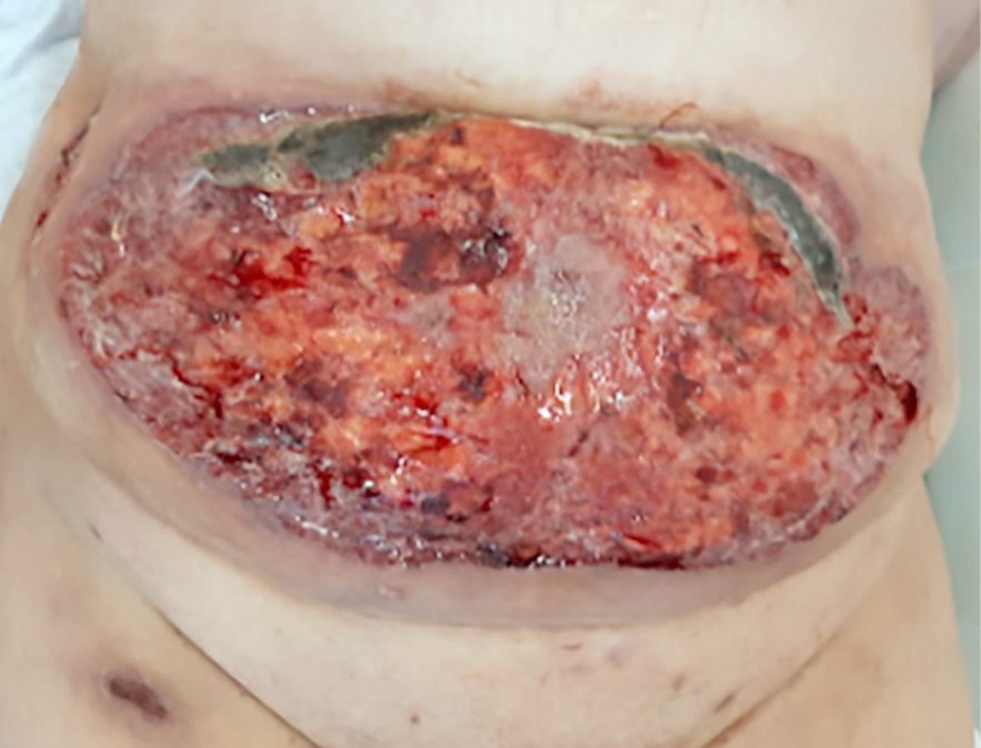 Локальный статус. Процесс ограниченный, асимметричный, островоспалительного характера, локализован на коже живота, представлен обширной язвой овальной формы с распространением на правую ягодицу, размером 24×45 см, с чёткими контурами, валикообразно приподнятыми краями, багрово-синюшной окраски. Дно язвы покрыто геморрагически-гнойным экссудатом, местами грануляциями фибрина. Вокруг язвы зона ярко-розовой эритемы. Субъективно беспокоит интенсивная болезненность в области язвенного дефекта (рис. 1).