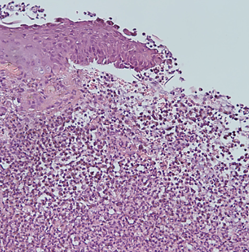 По данным гистологического исследования биоптата с краевой зоны язвы в эпидермисе определяются участок расщепления с формированием внутриэпидермального пузыря; участки отсутствия эпидермиса, покрытые гнойно-некротическим детритом; обильные поля густой нейтрофильной инфильтрации дермы с признаками лейкоцитокластического васкулита; очаги некрозов дермы (рис. 2).