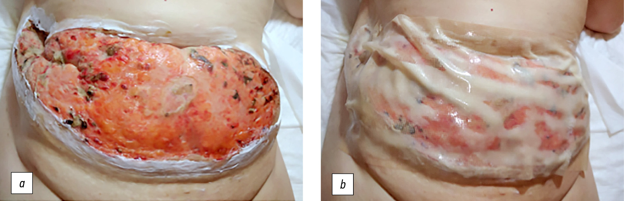 Рис. 3. Тот же пациент. Наружная терапия: а ― топические глюкокортикостероиды по периферии на область эритемы; b ― наложение раневой липидо-коллоидной неадгезивной повязки на полимерной сетчатой основе. / Fig. 3. The same patient. External therapy: а ― topical corticosteroids along the periphery to the area of erythema; b ― application of a nonadhesive lipidоcolloid wound dressing.