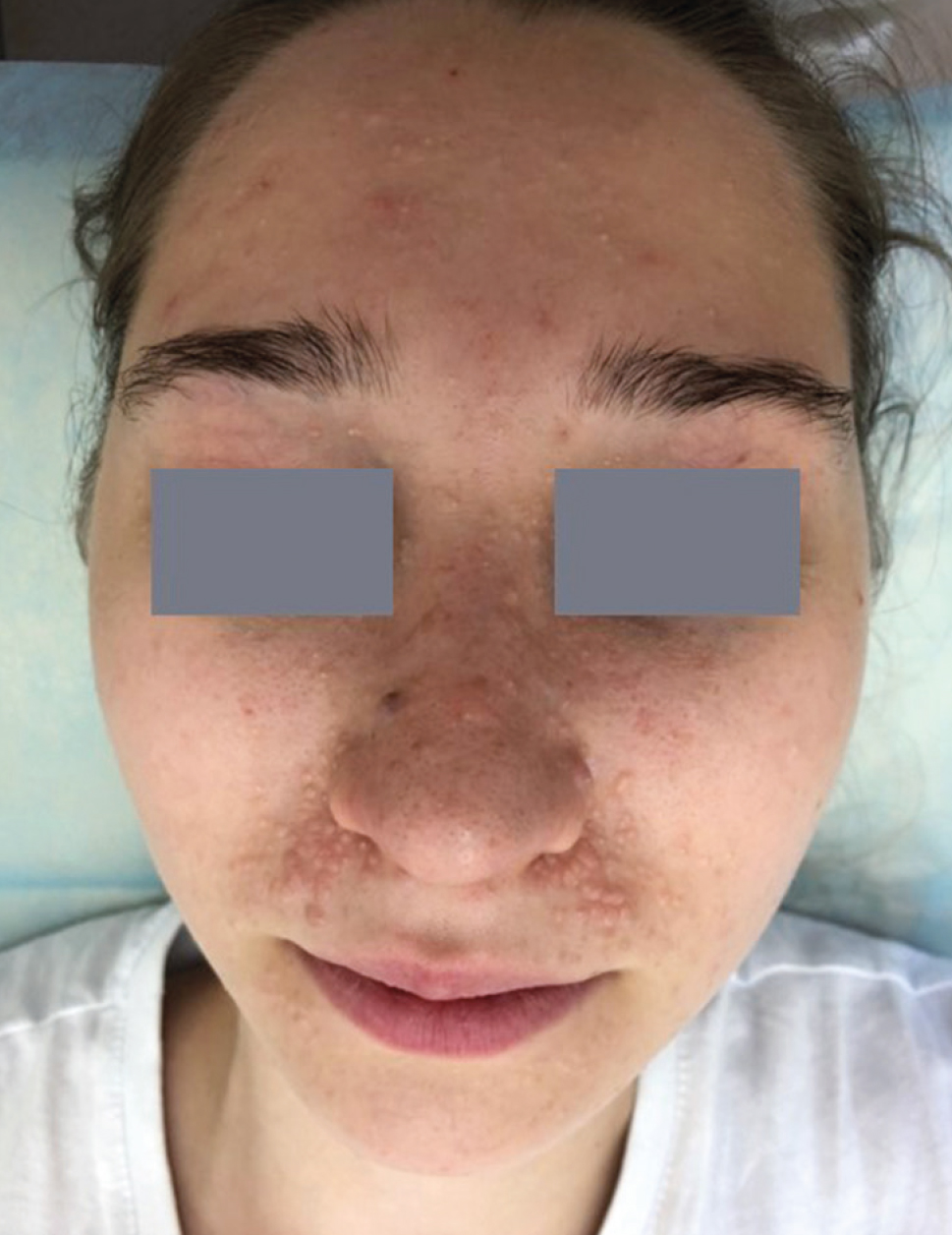 Анамнез болезни. Первые высыпания на коже лица появились приблизительно в одиннадцатилетнем возрасте. Обращалась к дерматологу по месту жительства, где был поставлен диагноз акне. На фоне назначенного лечения (азелаиновая кислота, крем 20%, 2 раза/сут, утром и вечером) высыпания не регрессировали. Обращалась к косметологу, который провёл курс срединных химических пилингов, после чего отметила прогрессирование роста и увеличение количества высыпаний. В последующем обращалась к другому дерматологу, который принял решение о проведении биопсии. Биопсия по месту жительства от 05.03.2018: образование располагается в дерме, имеет солидное строение, состоит из округлых мономорфных клеток, местами образующих палисадообразное расположение. В центре некоторых комплексов определяются концентрические массы кератогиалина. Заключение: «Сирингоэпителиома». Дальнейших исследований по месту жительства не проводили, новообразование расценили как единичное, стёкла не сохранились, блоки пациенткой не запрашивались.