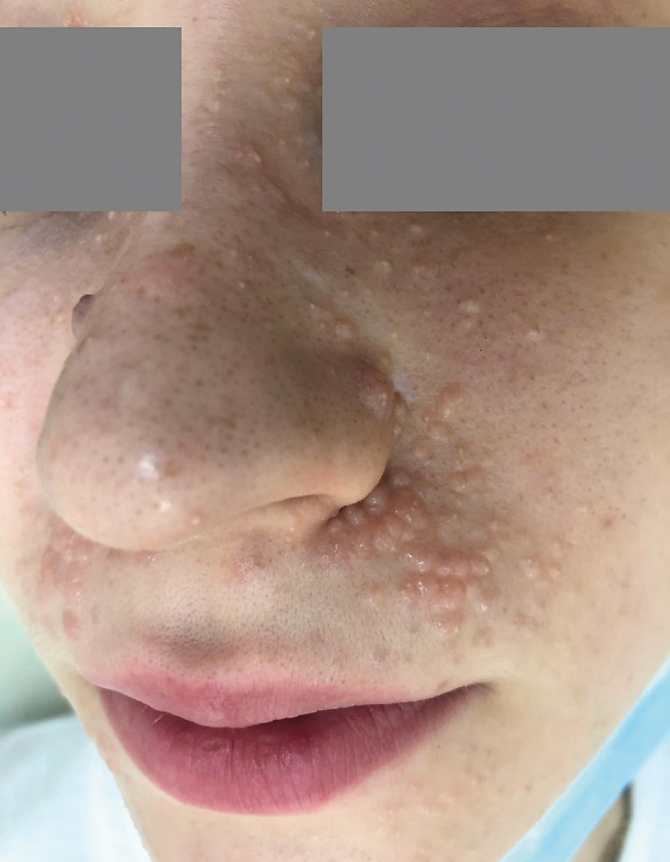 Status localis. Патологический кожный процесс носит распространённый характер. Новообразования локализованы на коже лица, располагаются относительно симметрично. Максимальное количество элементов сгруппировано в области носогубного треугольника с продолжением до внутренней части бровей (Х-образное расположение). Всего на коже лица пациентки более 80 полушаровидных плотных дермальных папул цвета от телесного и светло-розового до бурого, размером от 1 до 10 мм в диаметре. Поверхность элементов гладкая, в более крупных элементах видны расширенные сосуды, в отдельных просматриваются дольчатое строение и милиумоподобные включения (рис. 1, 2).