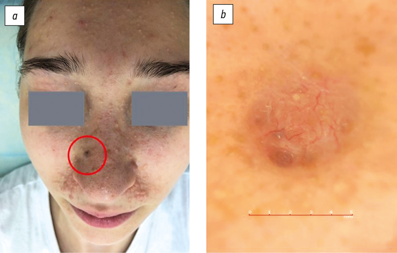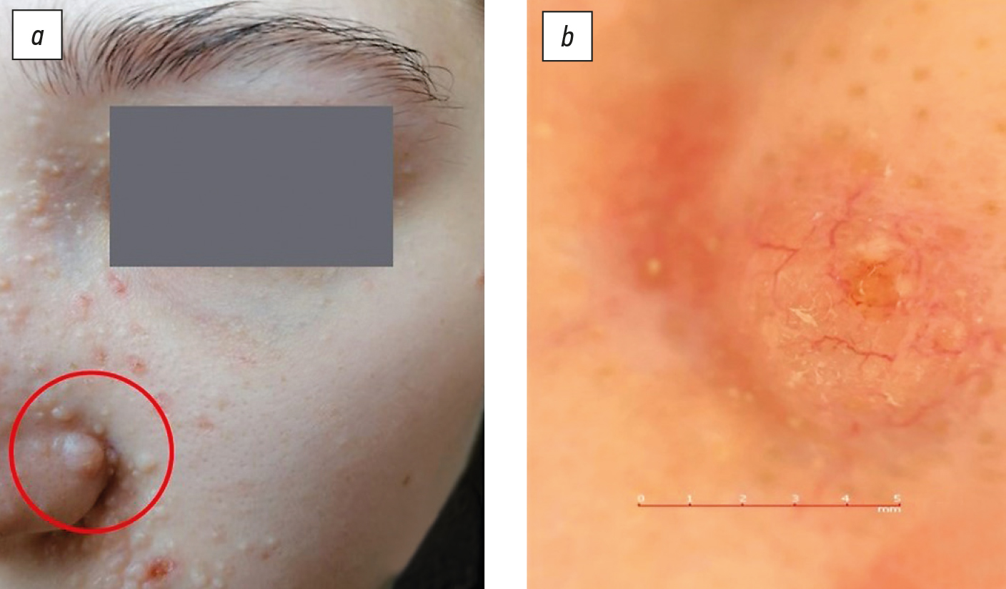 Рис. 3. Тот же пациент: а ― фото лица пациентки: в красном круге крупное новообразование кожи на спинке носа, взятое в дальнейшем для гистологического исследования (биоптат 1); b ― дерматоскопия новообразования кожи на спинке носа: дольчатое строение с сероватыми округлыми включениями, тонкие извитые сосуды.