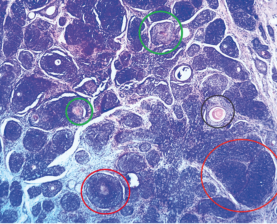 Рис. 5. Тот же пациент: гистологическое исследование (биоптат 1). Фрагмент кожи спинки носа с субэпителиальным ростом образования, построенного из мономорфных базалоидных клеток, формирующих обособленные эпителиальные комплексы в плотной фиброзной строме (красный круг), с наличием микрокист, содержащих кератиновые массы (чёрный круг), очаговой выстилкой эпителиальными клетками с инфундибулярной дифференцировкой (зелёный круг). Окраска гематоксилином и эозином, ×100.