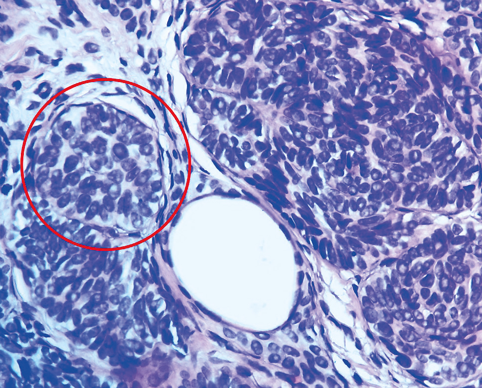 Рис. 6. Тот же пациент: гистологическое исследование (биоптат 2). Фрагмент кожи крыла носа с субэпителиальным ростом образования, построенного из мономорфных базалоидных клеток, формирующих обособленные комплексы в плотной фиброзной строме (красный круг). Окраска гематоксилином и эозином, ×400.