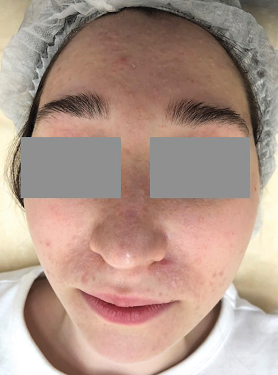 Рис. 1. Пациентка Н. 2001 года рождения: патологический кожный процесс на лице носит распространённый характер (высыпания относительно симметричны).