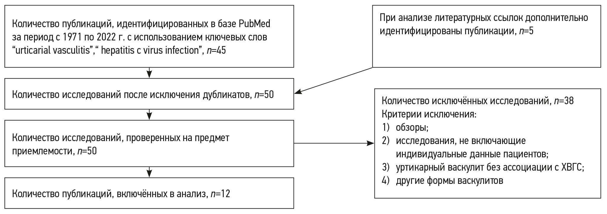 В базе данных PubMed проведён поиск клинических случаев УВ за период с 1971 по 2022 г. с использованием ключевых слов «urticarial vasculitis», «hepatitis C virus infection». Критериями включения в анализ являлись клинические случаи УВ; опубликованные клинические, лабораторные и гистологические данные пациентов; ХВГС; критериями исключения ― обзоры; исследования, не включающие индивидуальные данные пациентов; уртикарный васкулит без ассоциации с ХВГС; другие формы васкулитов. По результатам поиска идентифицированы 45 статей, дополнительно идентифицированы 5 статей при анализе литературных ссылок. По критериям включения/исключения в обзор были включены и проанализированы 13 клинических случаев УВ, ассоциированного с ХВГС (рис. 1, приложение 1) [6–17]. Все клинические случаи были оценены по стандартизированным шкалам (JBI checklist) (приложение 2). Количественные данные представлены как медиана и межквартильный интервал.