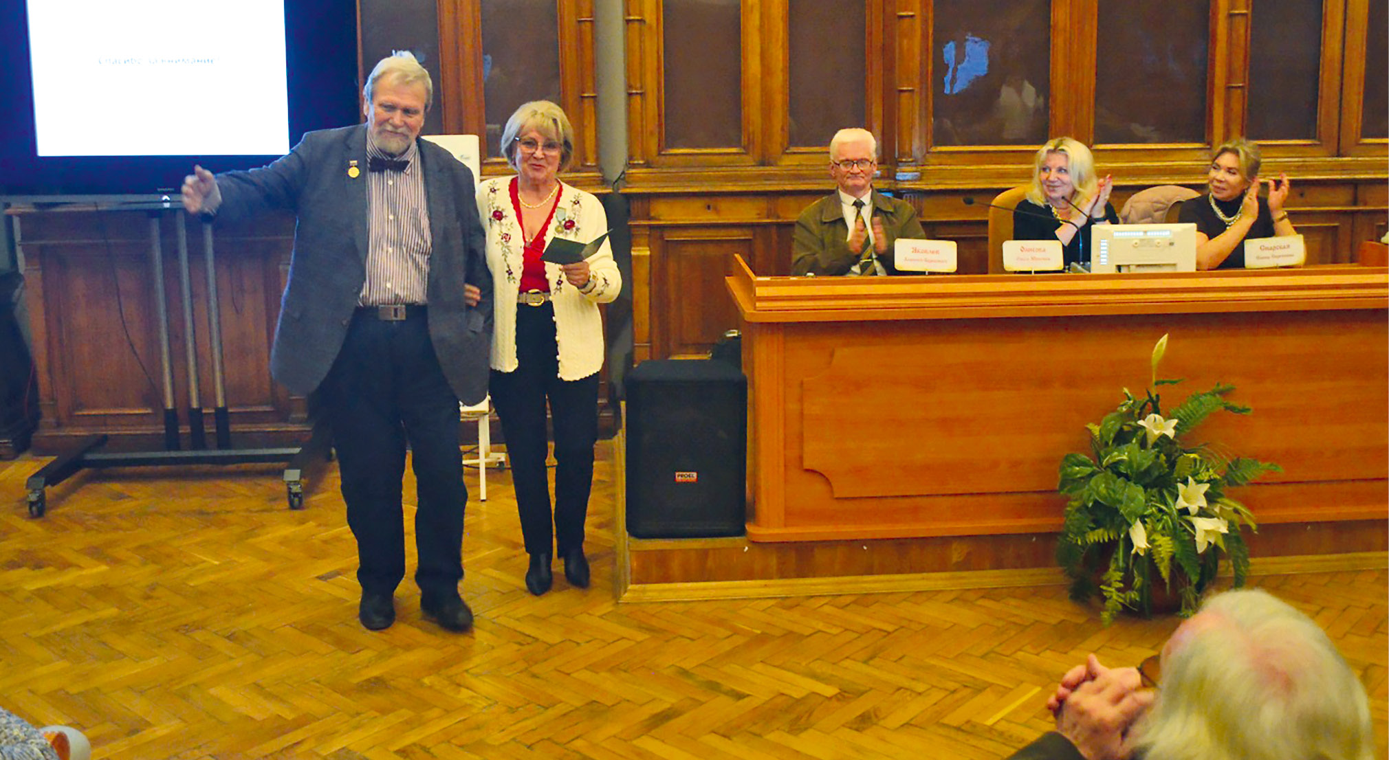 Проф. С.А. Бурова вручает почётную медаль Национальной академии микологии юбиляру В.В. Савенкову за вклад в развитие микологии России. В Президиуме заседания МОДВ чл.-корр. РАН, проф. О.Ю. Олисова (в центре), проф. Е.С. Снарская, доц. А.Б. Яковлев. / Prof. S.A. Burova presents an honorary medal to the hero of the day V.V. Savenkov for his contribution to the development of mycology in Russia. In the Presidium of the MSDC meeting: Corresponding Member of the Russian Academy of Sciences, prof. O.Yu. Olisova (in the center), prof. E.S. Snarskaya, assoc. prof. A.B. Yakovlev.