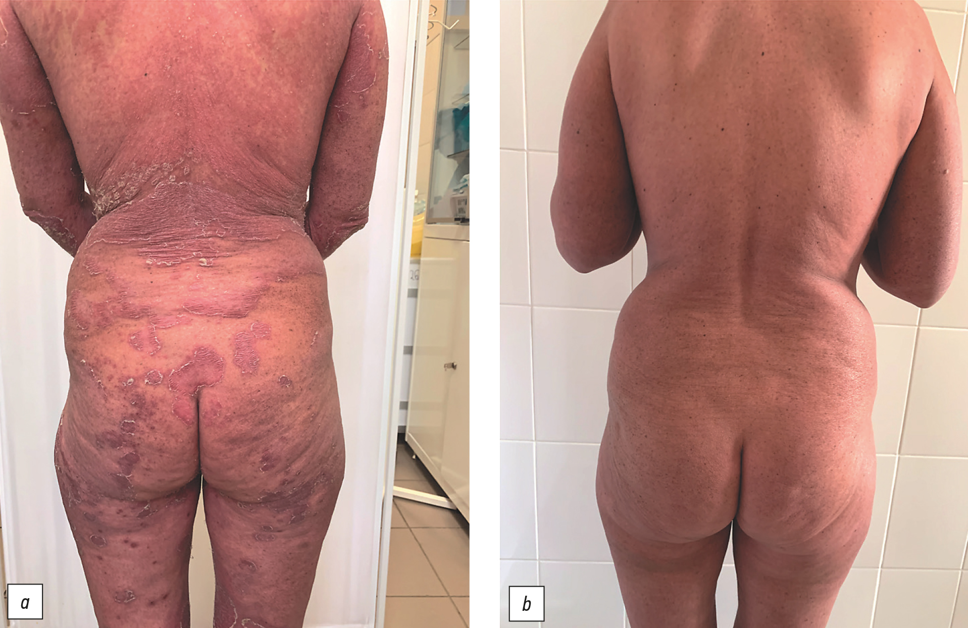 Рис. 3. Пациентка Б. (вторая группа) с диагнозом вульгарного псориаза до (a) и после (b) 24 недель лечения.