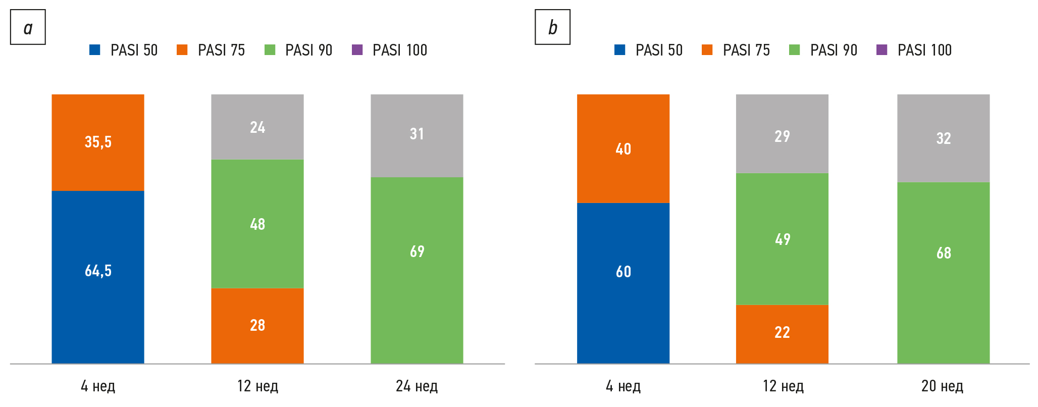 Во второй группе (секукинумаб + метотрексат) на 4-й неделе терапии PASI 50 зафиксирован у 60% пациентов, PASI 75 ― у 40%. В процессе лечения на 12-й неделе PASI 75 достигли 22%, PASI 90 ― 49%, PASI 100 ― 29% пациентов. На 24-й неделе PASI 90 был у 68%, PASI 100 ― у 32% (рис. 3).