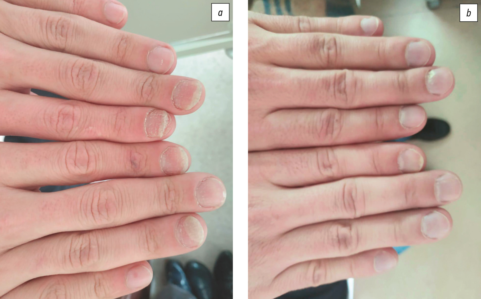 Рис. 2. Пациент В. (первая группа) с диагнозом вульгарного псориаза до (a) и после (b) 24 недель лечения.