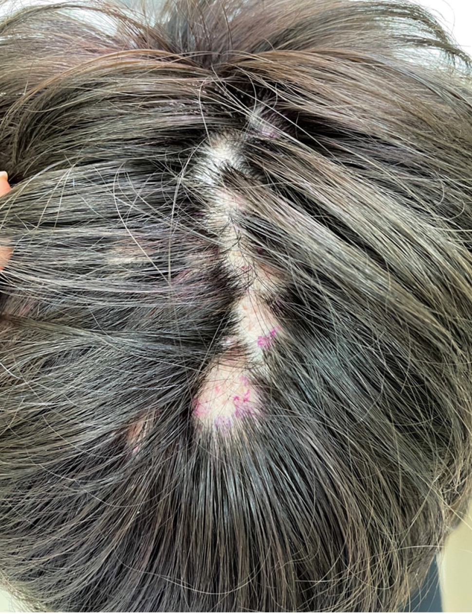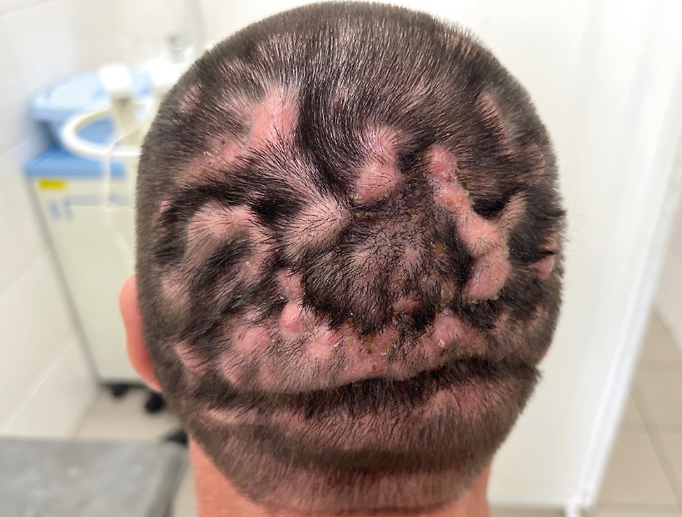 Рис. 6. Пациент С., 39 лет. Диагноз: «Триада фолликулярной окклюзии. Рассекающий целлюлит волосистой части головы. Гнойный гидраденит. Конглобатные акне». В области волосистой части головы множественные подкожные свищевые ходы, соединяющиеся между собой; ассоциированная рубцовая алопеция с формированием келоидных рубцов, развивающаяся при отсутствии адекватного лечения на ранних стадиях.