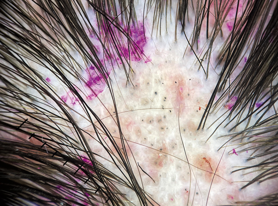 Рис. 3. Тот же пациент. Трихоскопия в зоне очаговой потери волос: множественные чёрные точки, жёлтые 3Д-точки с волосяными стержнями и без них, веллусные волосы, фиолетовые зоны, белые зоны фиброза, немногочисленные pili torti (перекрученные волосы).