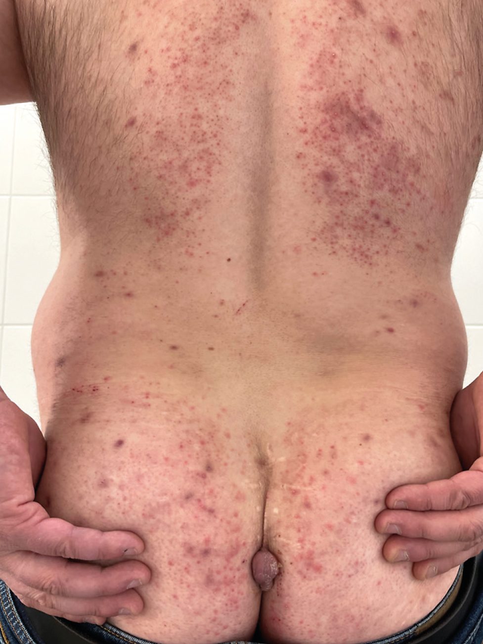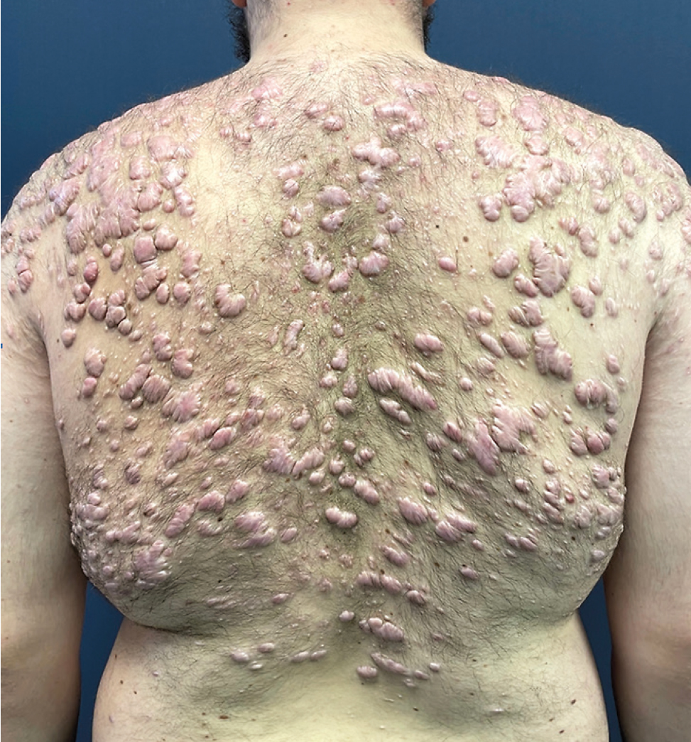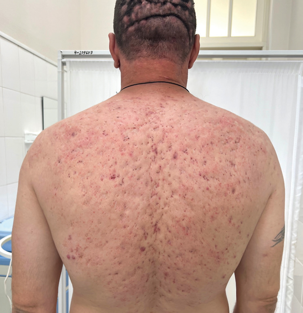 Рис. 4. Пациент Б., 19 лет. Диагноз: «Синдром фолликулярной окклюзии. Гнойный гидраденит. Конглобатные акне». Представлены конглобатные акне с формированием келоидных рубцов на спине, сходная картина наблюдается на груди и лице.