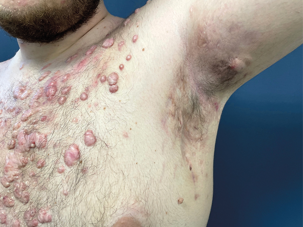 Рис. 5. Тот же пациент. Типичное поражение подмышечных областей при гнойном гидрадените. В локальном статусе обращает на себя внимание рубцевание и единичный воспалительный узел в области левой подмышки у пациента с двусторонним вовлечением, гнойный гидраденит в стадии разрешения, уменьшение выраженности воспалительных явлений.