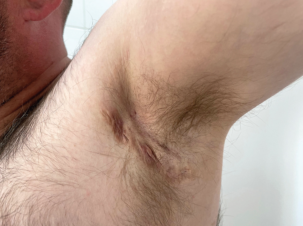 Рис. 11. Тот же пациент. На фотографии виден неактивный очаг гнойного гидраденита в подмышечной области, представленный несколькими шнуровидными рубцами в исходе предшествующего воспалительного процесса.