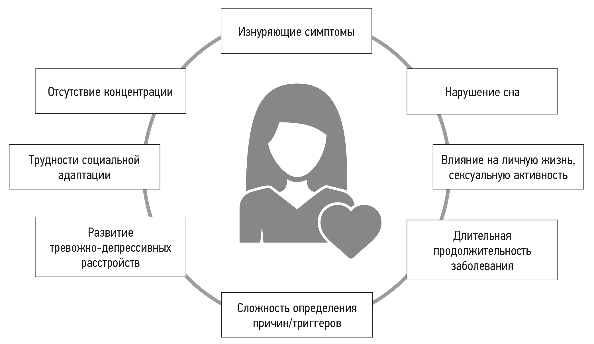 ХСК оказывает значительное влияние на качество жизни пациентов. Выраженный зуд, непредсказуемый характер уртикарных высыпаний и ангиоотёков являются основными факторами, влияющими на физическое, эмоциональное и социальное состояние пациентов [5]. Пациенты отмечают нарушение сна, развитие тревожно-депрессивных расстройств, выраженное снижение концентрации внимания, трудности социальной адаптации, влияние на семейную жизнь, спортивные достижения и досуг (рис. 1) [6–8].