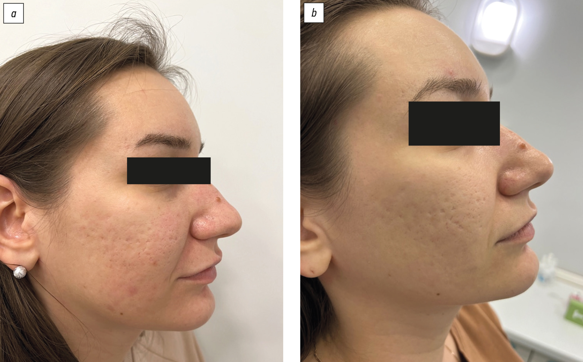 Рис. 4. Пациент М., 27 лет, атрофические рубцы постакне IV степени тяжести: a ― до лечения; b ― после лечения.