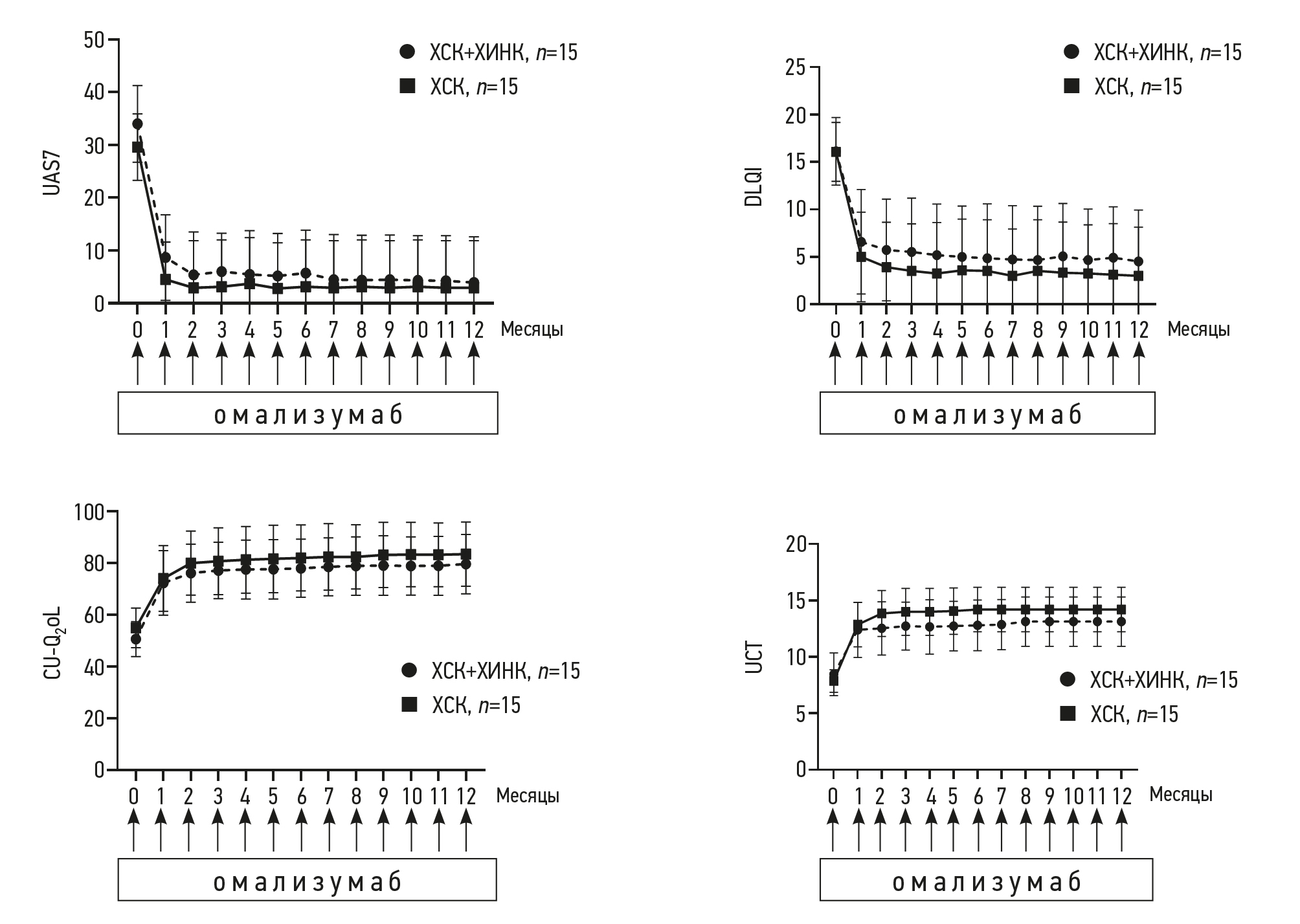 При сравнении показателей до лечения и через 1 месяц после первой инъекции омализумаба в дозе 300 мг подкожно отмечалось значительное снижение тяжести крапивницы (UAS), повышение контроля над заболеванием (UCT) и качества жизни (DLQI, Cu-Q2oL), при этом улучшенные результаты опросников и выраженный клинический эффект сохранялись на этом уровне на протяжении всего курса лечения (рис. 1).