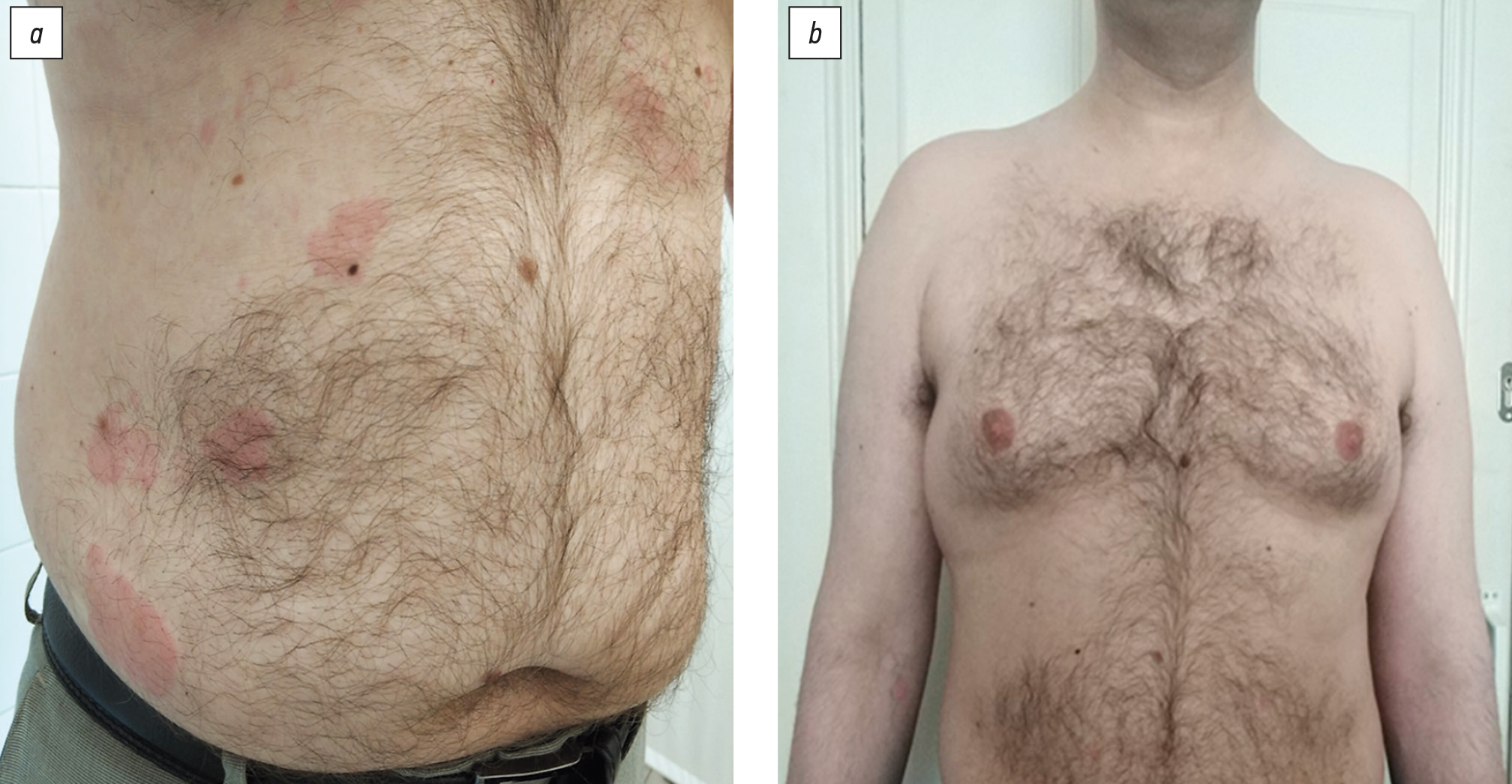 Рис. 2. Пациент А. (первая группа), диагноз хронической спонтанной крапивницы: до лечения (a) и через 6 месяцев на фоне лечения препаратом омализумаб в дозе 300 мг (b).