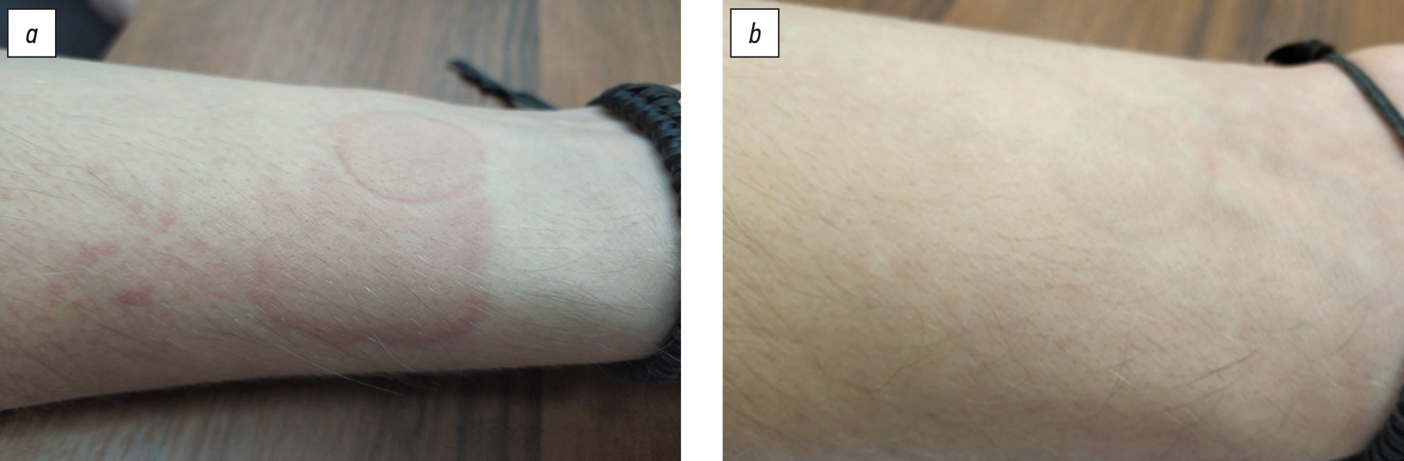 Рис. 3. Пациент А. (вторая группа), диагноз сочетанной формы хронической спонтанной и хронической индуцированной крапивницы: оценка эффективности лечения провокационным тестом с помощью кубика льда до лечения (a) и через 4 недели после лечения (b).