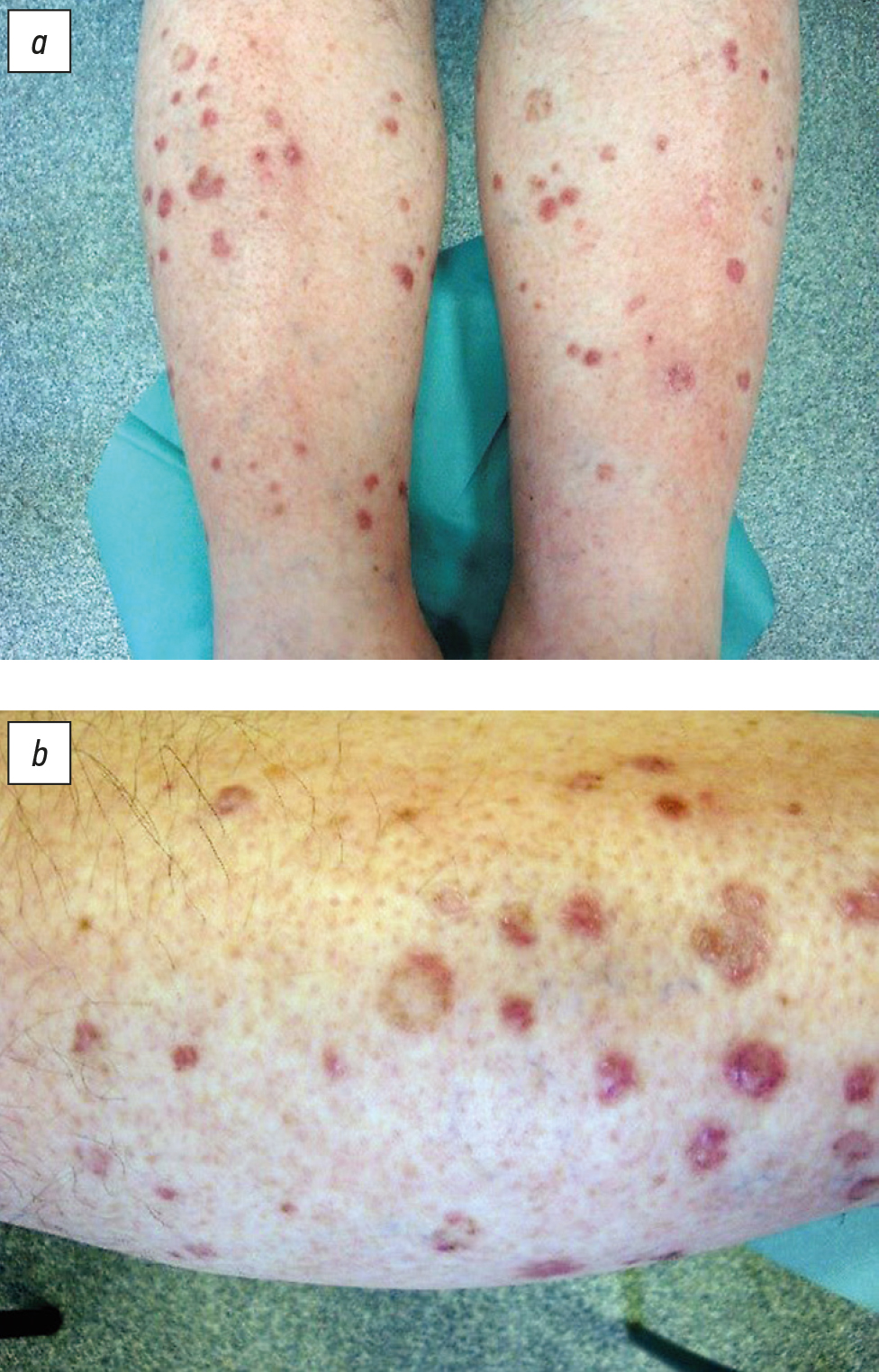 Fig. 12. Patient К., 15 years. Porokeratosis Mibelli: a ― lower extremities; b ― image fragment.