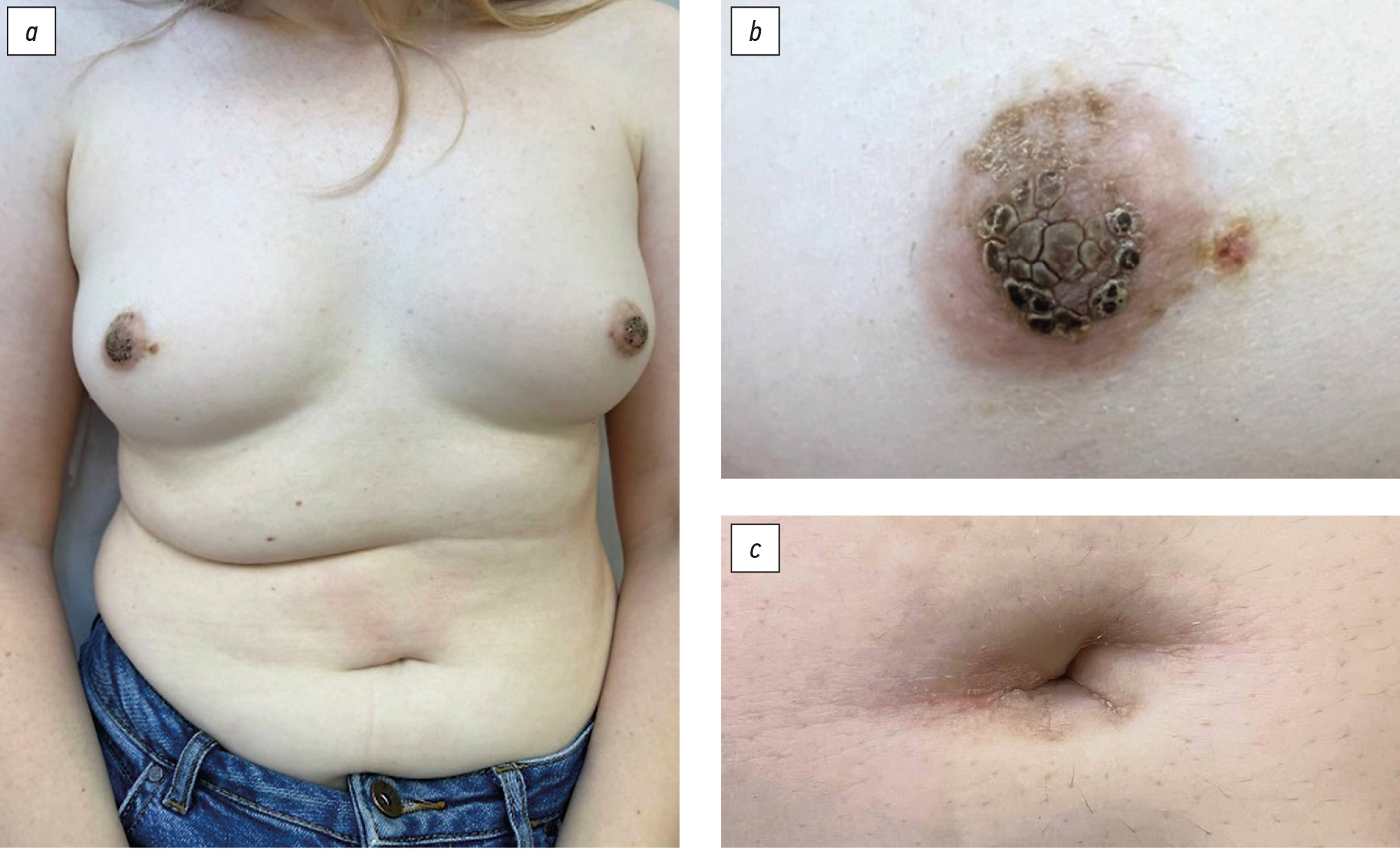 Рис. 1. Пациентка Б., 39 лет, кератоз Отто–Монкорпса: а ― поражение сосков и ареола молочных желёз (общий вид); b ― кератотические высыпания в зоне соска и ареолы правой молочной железы; с ― кератотические высыпания в зоне пупочной ямки.