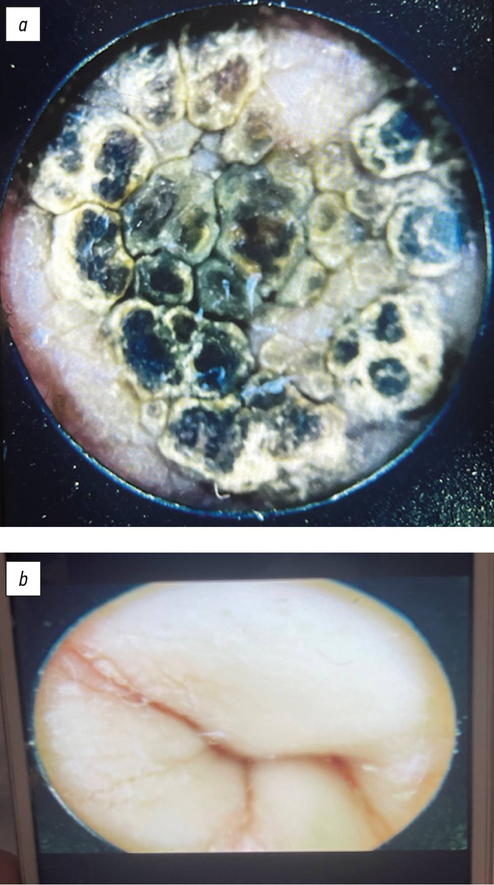 Рис. 2. Пациентка Б., 39 лет, кератоз Отто–Монкорпса: а ― дерматоскопическая картина зоны соска и ареолы молочной железы; b ― дерматоскопическая картина зоны пупочной ямки.