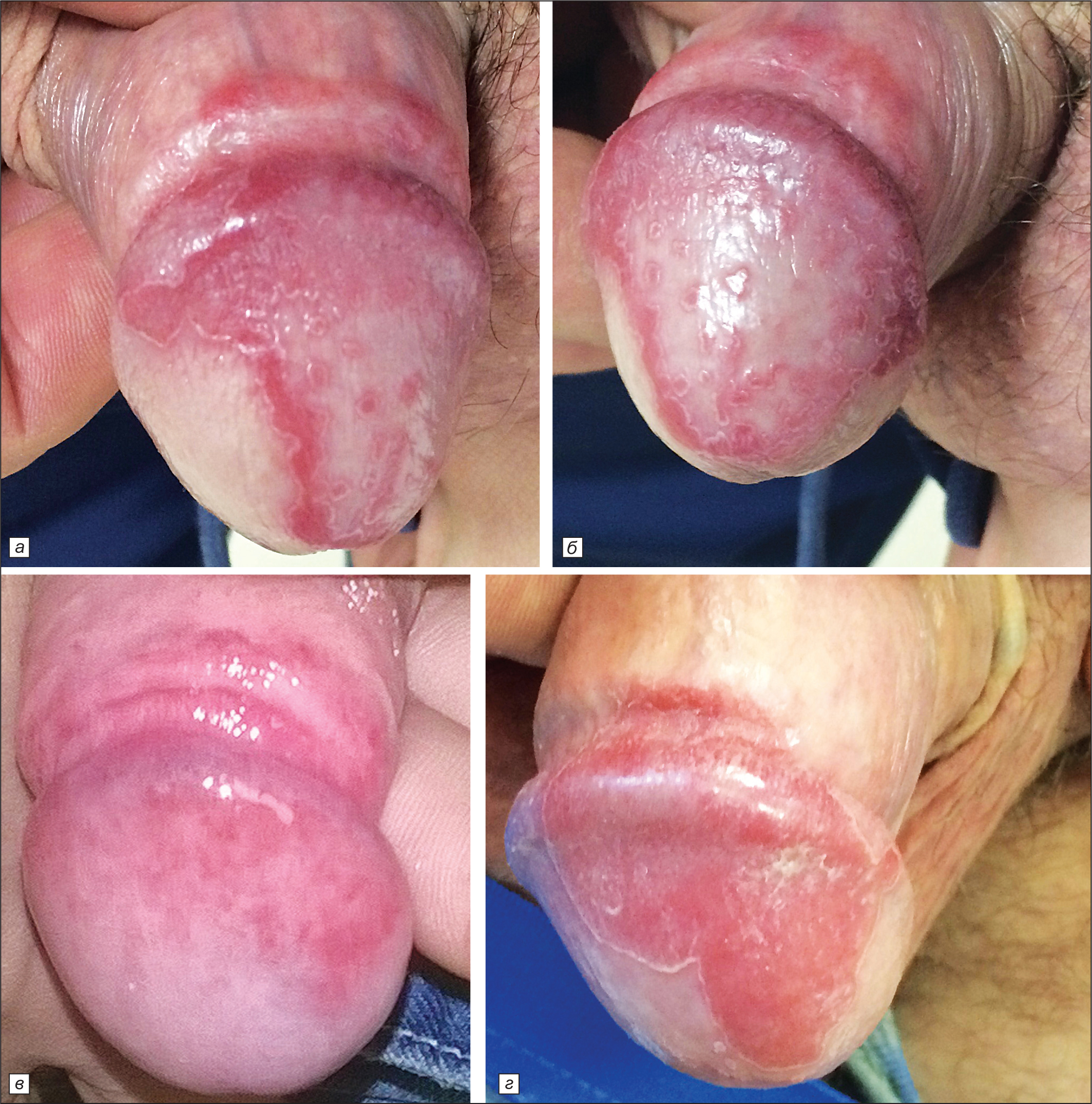 Локализация высыпаний у 2 больных была на головке полового члена (при этом у одного с распространением на губки наружного отверстия уретры), на венечной бороздке крайней плоти – у 7 (рис. 1, а–г).