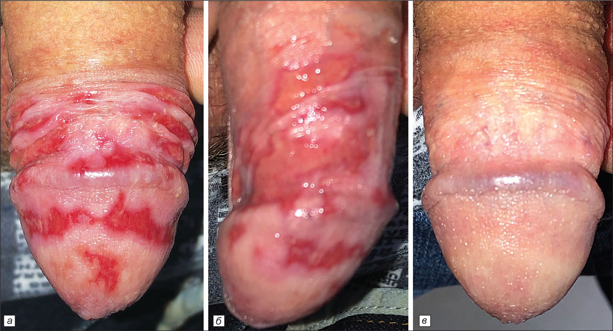 Рис. 2. Больной С., 43 года. Эритроплазия Кейра. Поражение головки и внутреннего листка крайней плоти. а – клиническая картина при поступлении; цирцинарные папулезные элементы; б – «лакированные» папулы, симулирующие эрозивные дефекты; в – через 3 нед от начала лечения.