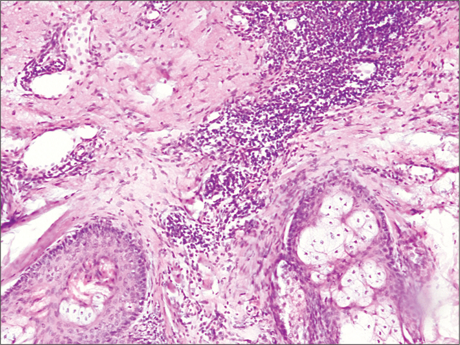 При ультразвуковом исследовании: трансректально – явления хронического простатита; лимфатические паховые узлы не увеличены. Гистологическое исследование: неравномерный акантоз, участки гипер- и паракератоза; многоядерные атипичные клетки с вакуолизированной цитоплазмой, гиперхромированными ядрами, с признаками митозов. В дерме обнаружено расширение сосудов, лимфоцитарные инфильтраты с плазматическими клетками (рис. 3).