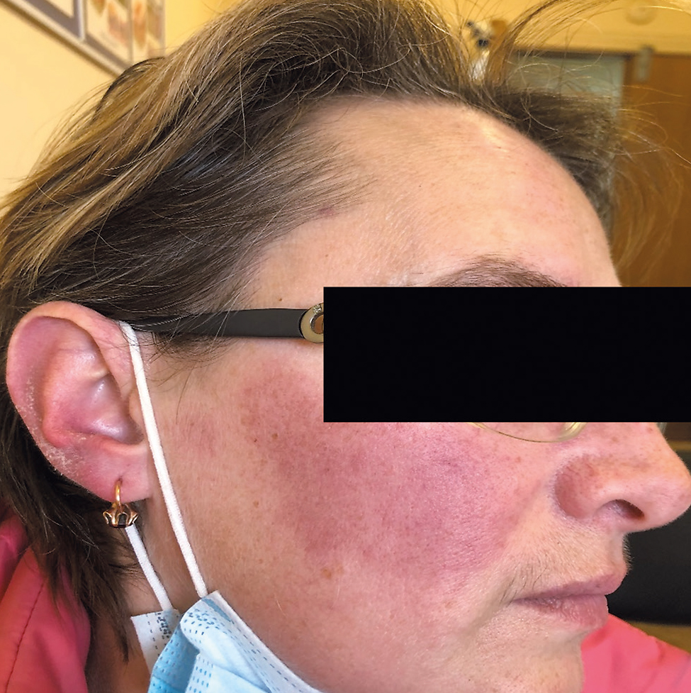 Fig. 1. Patient S., 42 years old, erythematous-telangiectatic form of rosacea. The process is characterized by damage to the skin of the cheeks and nose. There is a long-existing erythema with numerous telangiectasias. During dermatoscopy, dilated capillaries are determined.