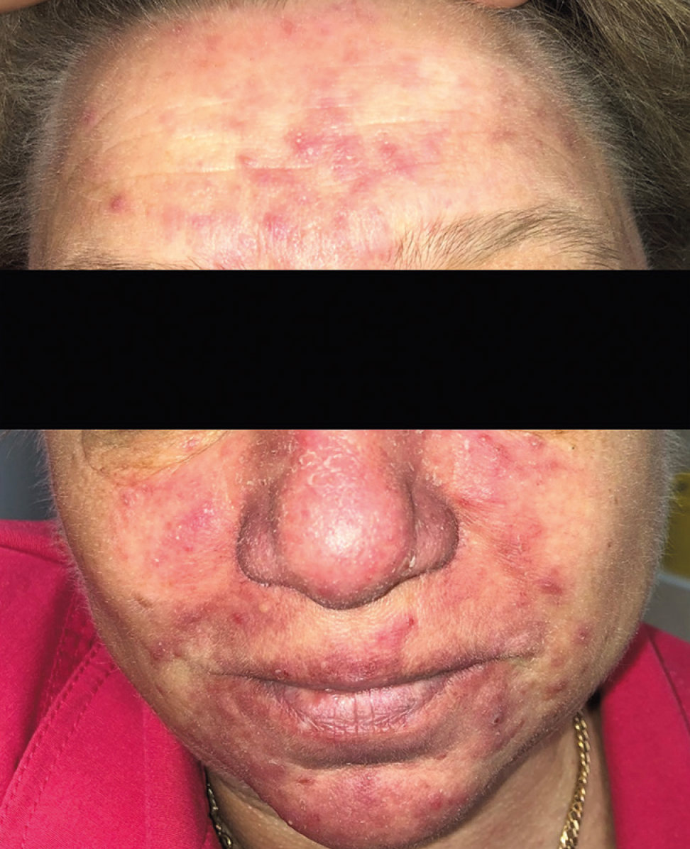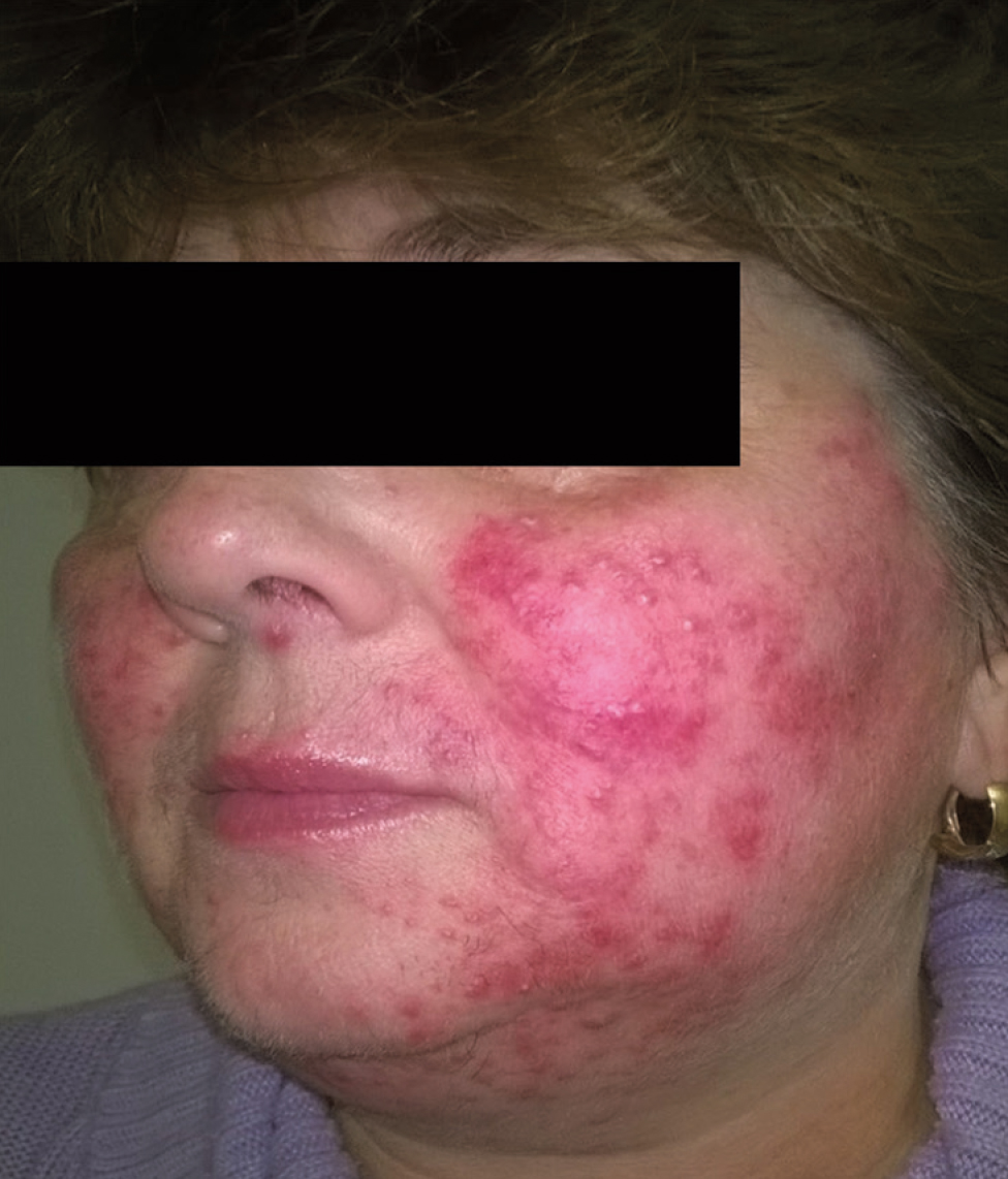 Рис. 2. Больная А., 51 год, папулёзно-пустулёзная форма розацеа. Процесс расположен в области Т-зоны лица, щёк. Имеются отдельные милиарные и лентикулярные папулы, ярко-розового цвета, плотноватой консистенции, расположенные на фоне эритемы. В области щёк и подбородка имеются сгруппированные папулопустулёзные элементы, в складках ― отдельные гнойные геморрагические корки.