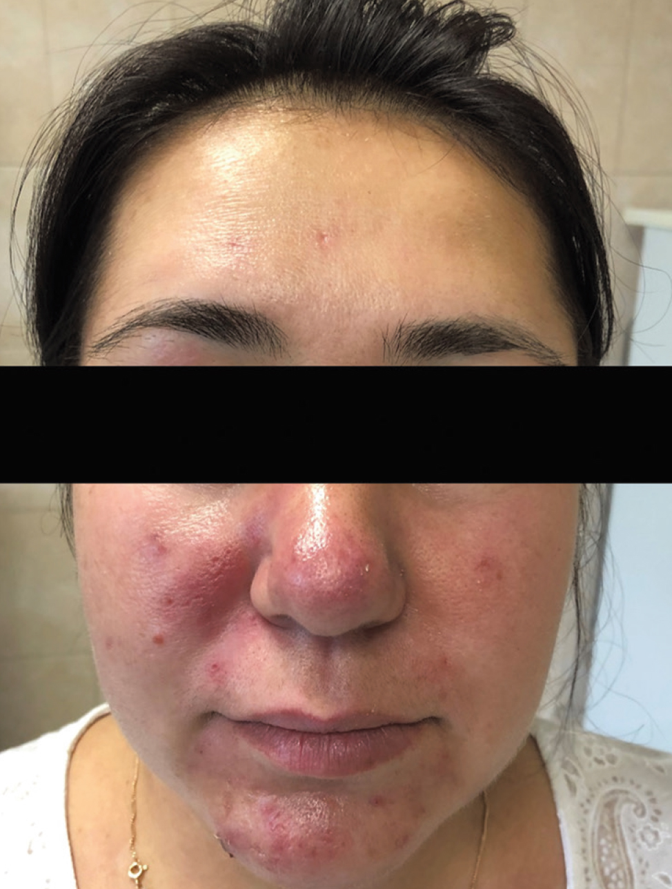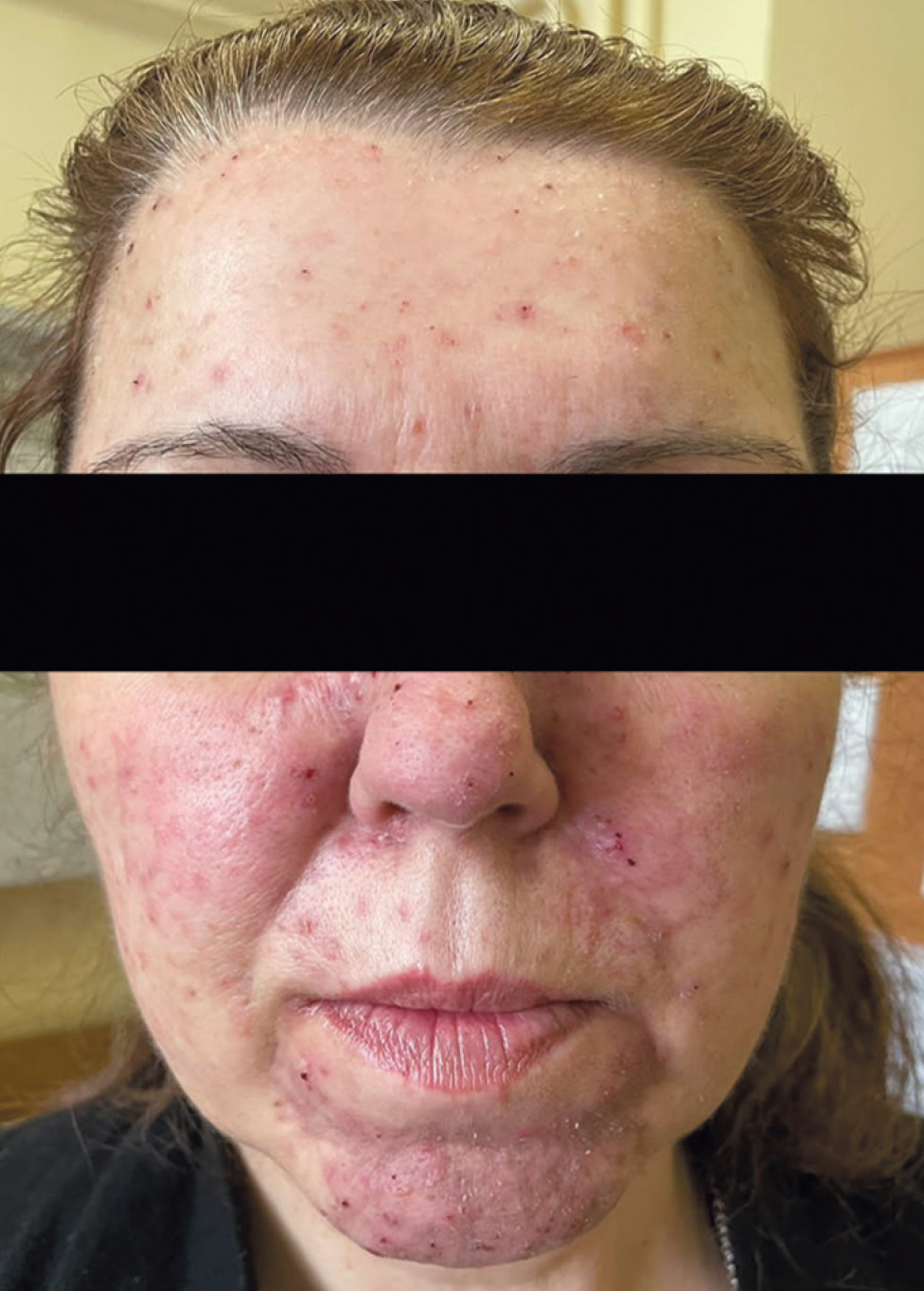 Fig. 4. Patient K., 38 years old, the steroid form of rosacea. The process is located on the skin of the forehead, cheeks and chin, is represented by erythema of a red-cyanotic color, with clear boundaries; on its surface there are multiple papular-pustular elements and telangiectasia.