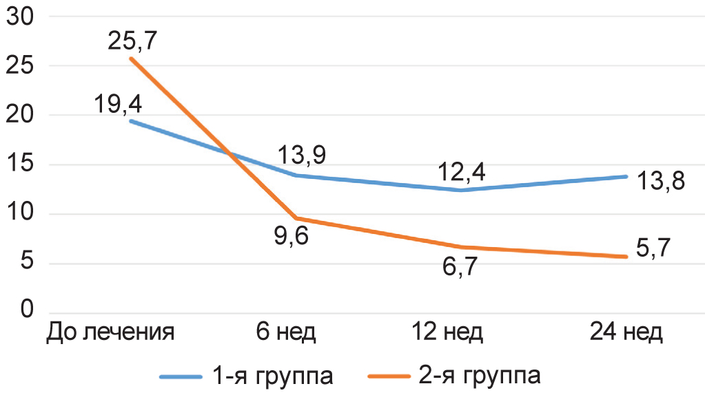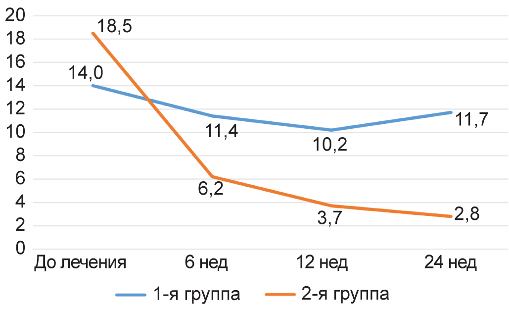 Анализ динамики показателя PASI в процессе лечения в группах больных псориазом показал, что если до начала терапии различий не отмечено, то спустя 6, 12 и 24 нед более выраженное уменьшение данного параметра было у больных второй группы (рис. 1). Динамика показателя ДИКЖ также показала более выраженное снижение именно во второй группе (рис. 2).