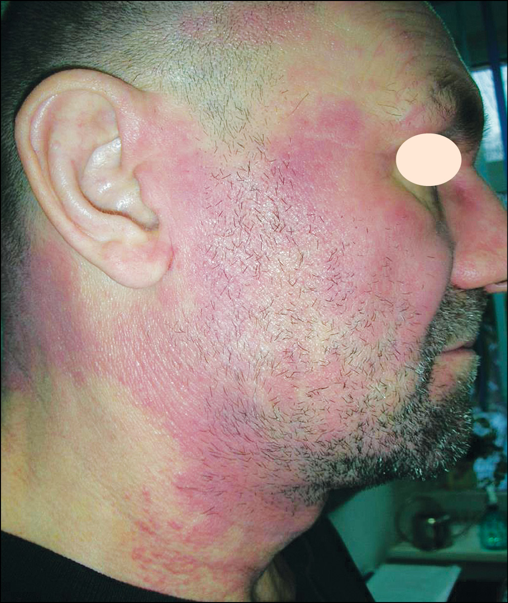 Рис. 1. Отёчная эритема на лице, напоминающая крапивницу, у пациента в возрасте 54 лет с COVID-19.