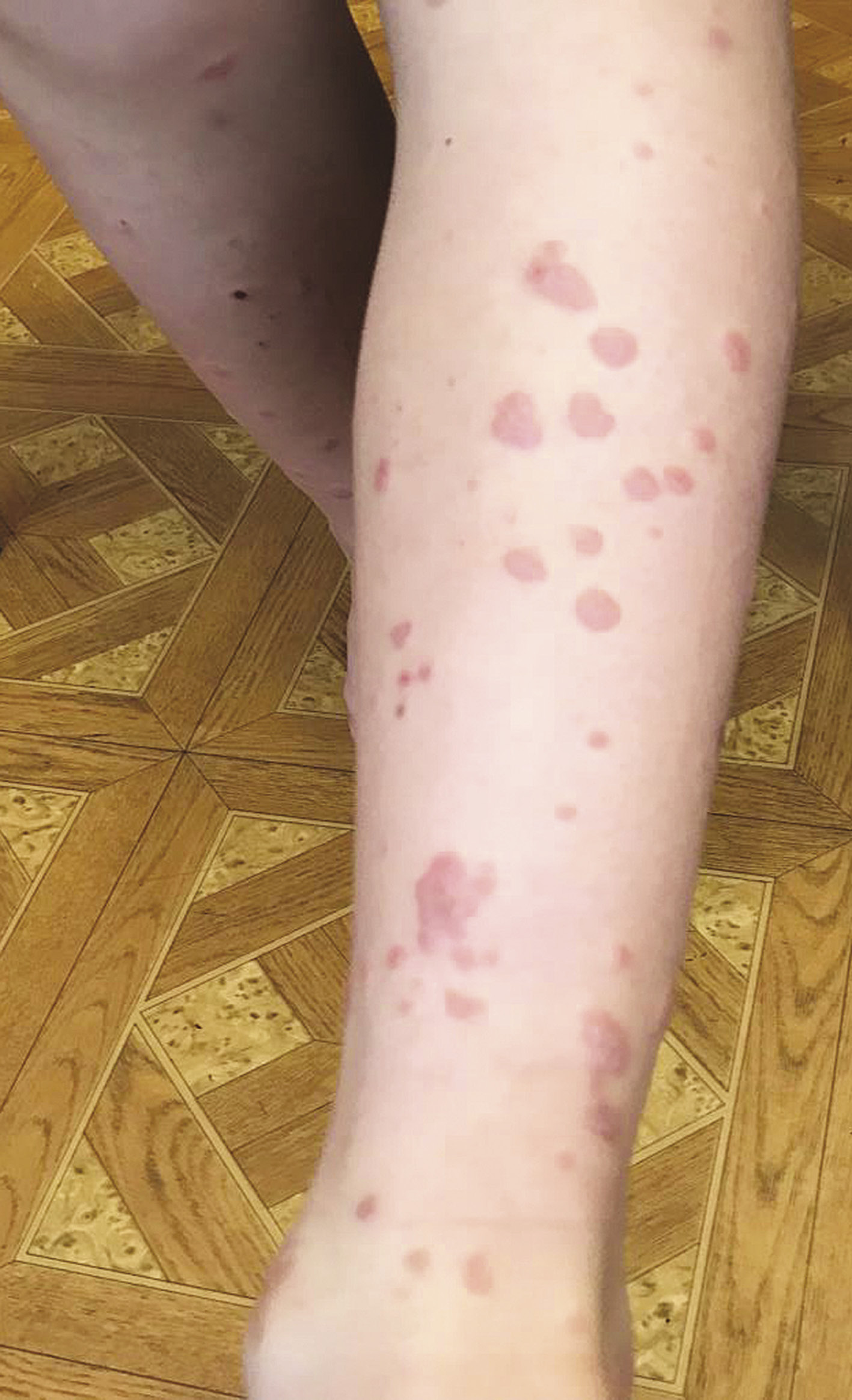 Наблюдение 4. Девушка, возраст 17 лет, COVID-положительная. Обратилась к дерматологу с высыпаниями на нижних конечностях. Наблюдается у врача по поводу акне, однако в середине апреля заметила несколько возвышающихся над уровнем окружающей кожи высыпаний на нижних конечностях без субъективных ощущений, которые увеличились в количестве за 5 дней. Перед появлением высыпаний першило в горле, в связи с чем полоскала горло раствором хлоргексидина. Общее самочувствие было хорошим, температура тела нормальная. Сопутствующие заболевания: хронический гастрит. Обратилась к врачу. Из анамнеза установлено, что 2 нед назад тесно общалась с подругой, у которой впоследствии была диагностирована новая коронавирусная инфекция. При осмотре: на коже нижних конечностей сыпь представлена плоскими папулами и бляшками диаметром от 0,5 до 1,5 см, ярко-розового цвета округлых очертаний с резкими границами и гладкой поверхностью. Папулы склонны к группировке и формированию бляшек неправильных очертаний в результате слияния очагов поражения (рис. 4). По рекомендации дерматолога применяла кортикостероидную мазь (бетаметазон) дважды в день. Через 7 дней высыпания полностью разрешились. При обследовании у пациентки лабораторно был подтверждён COVID-19, на КТ – лёгкие без патологии.