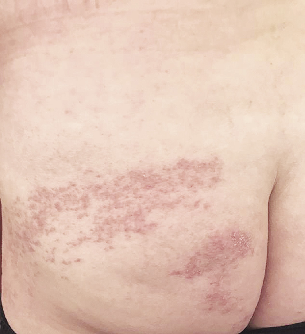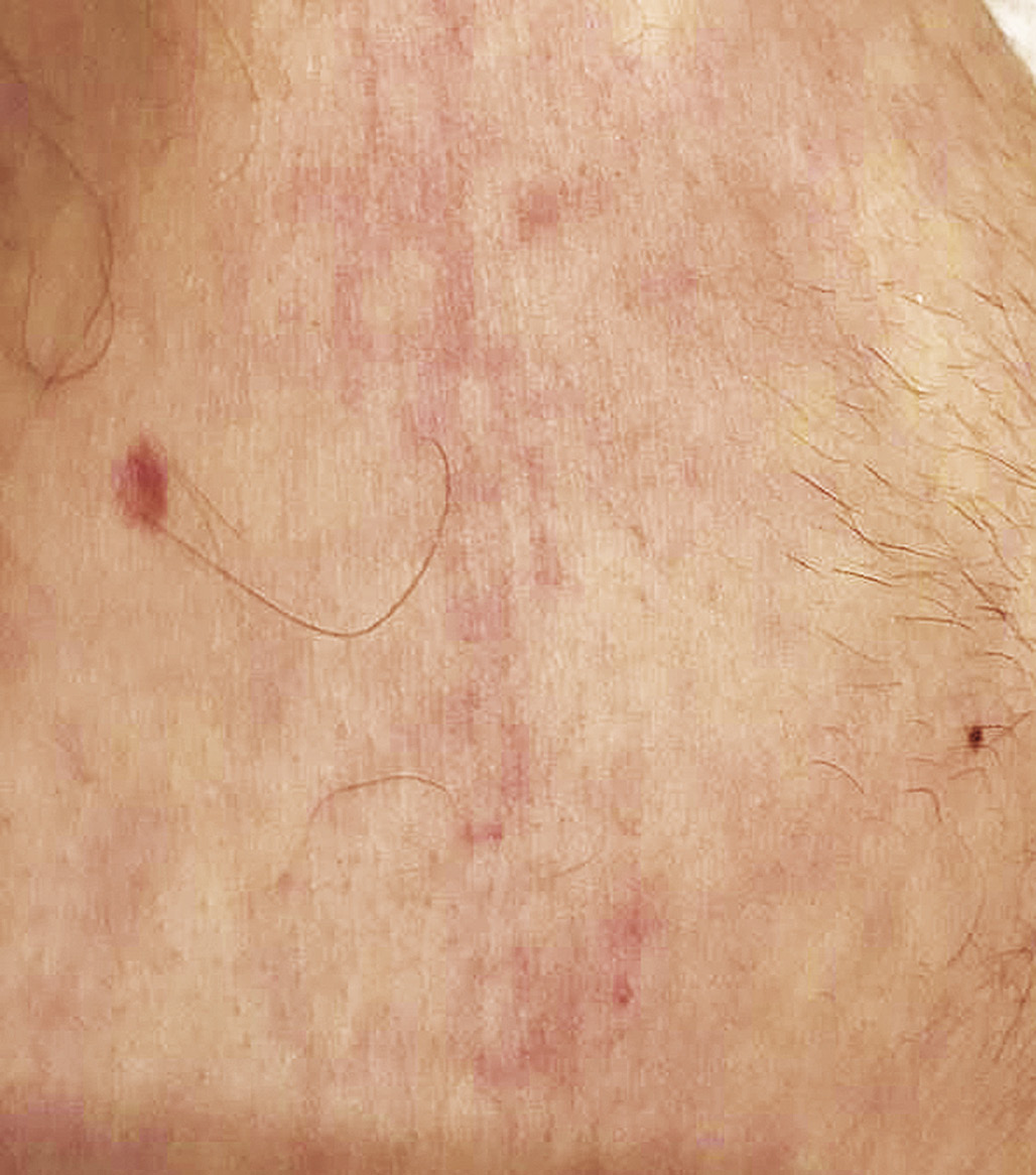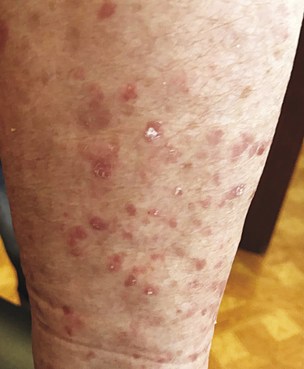 Рис. 12. Сгруппированные папулёзные высыпания с образованием бляшки на коже ягодиц у пациентки в возрасте 61 года с COVID-19.