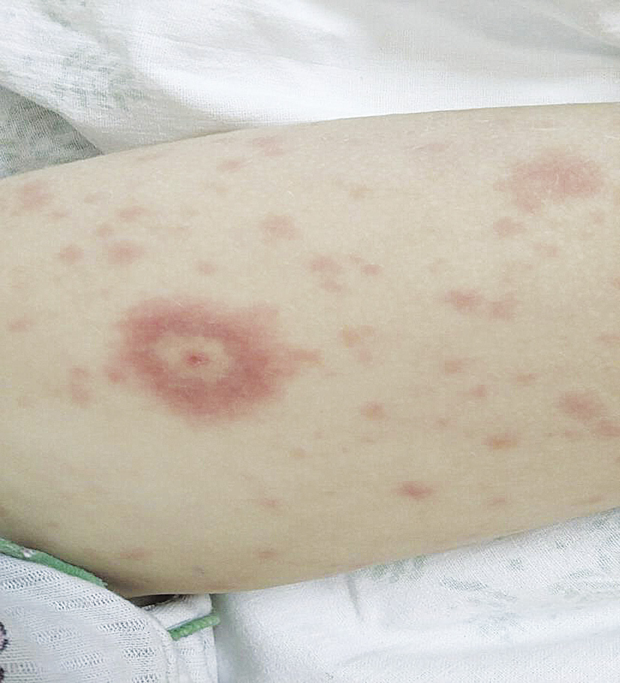 Рис. 6. Распространённая везикулёзная сыпь и мишенеподобные эритематозные очаги, напоминающие многоформную экссудативную эритему, у 8-летнего мальчика с COVID-19.