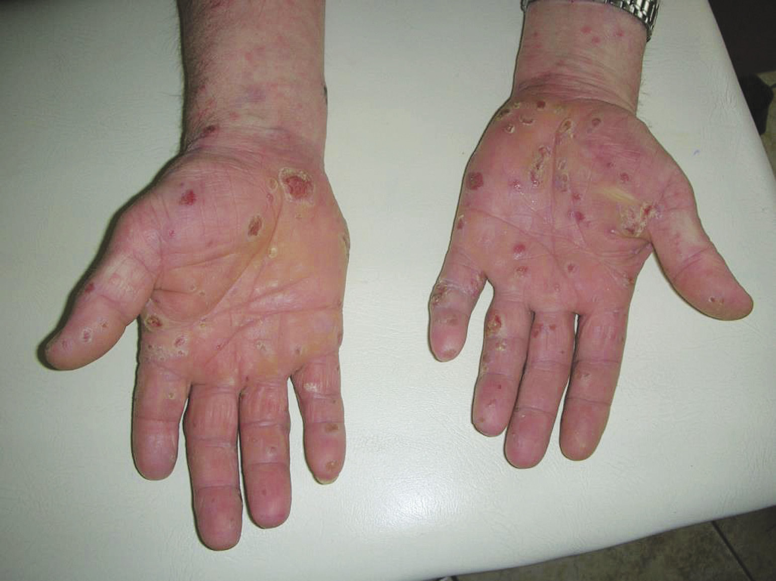 Рис. 8. Везикулёзно-буллёзные высыпания на ладонях, на- поминающие истинную экзему, у пациента в возрасте 43 лет с COVID-19.