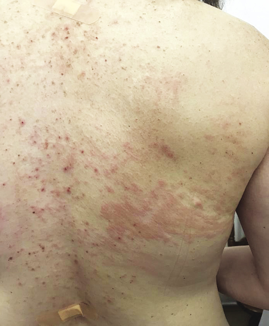 Рис. 10. Папулёзно-везикулёзные и уртикарные высыпания на коже спины и боковых поверхностях туловища у пациента в возрасте 37 лет с COVID-19.