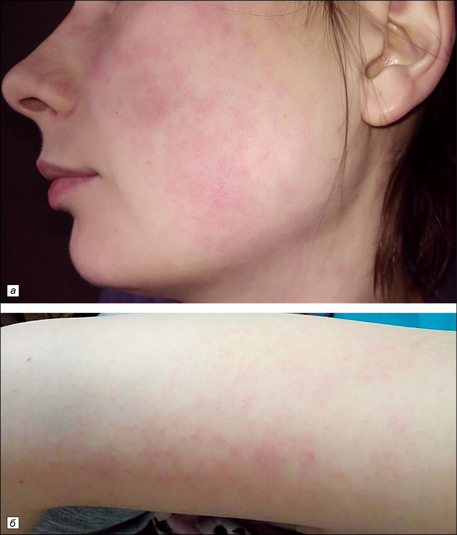 Рис. 15. Распространённый характер эритемы в виде воспалительных отёчных пятен у паци ентки в возрасте 30 лет с COVID-19: а – эритема лица; б – пятнистая сыпь на руке.