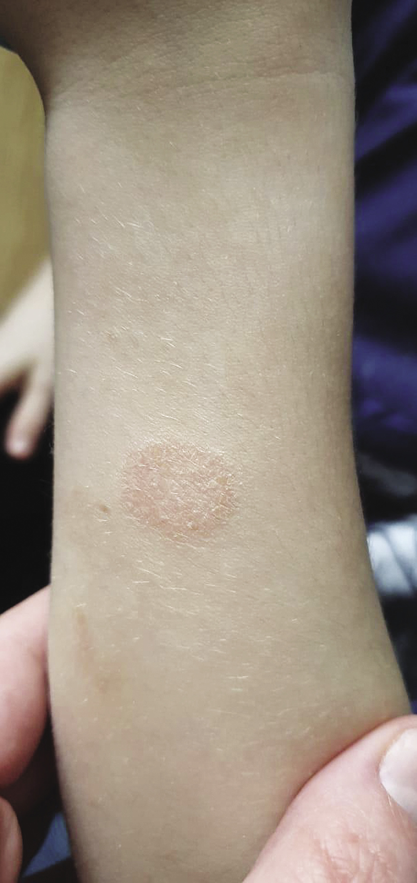 Рис. 17. Бляшка на коже предплечья по типу микоза гладкой кожи у ребёнка пациентки с COVID-19 (см. рис. 16). Тест на COVID у ребёнка положительный.