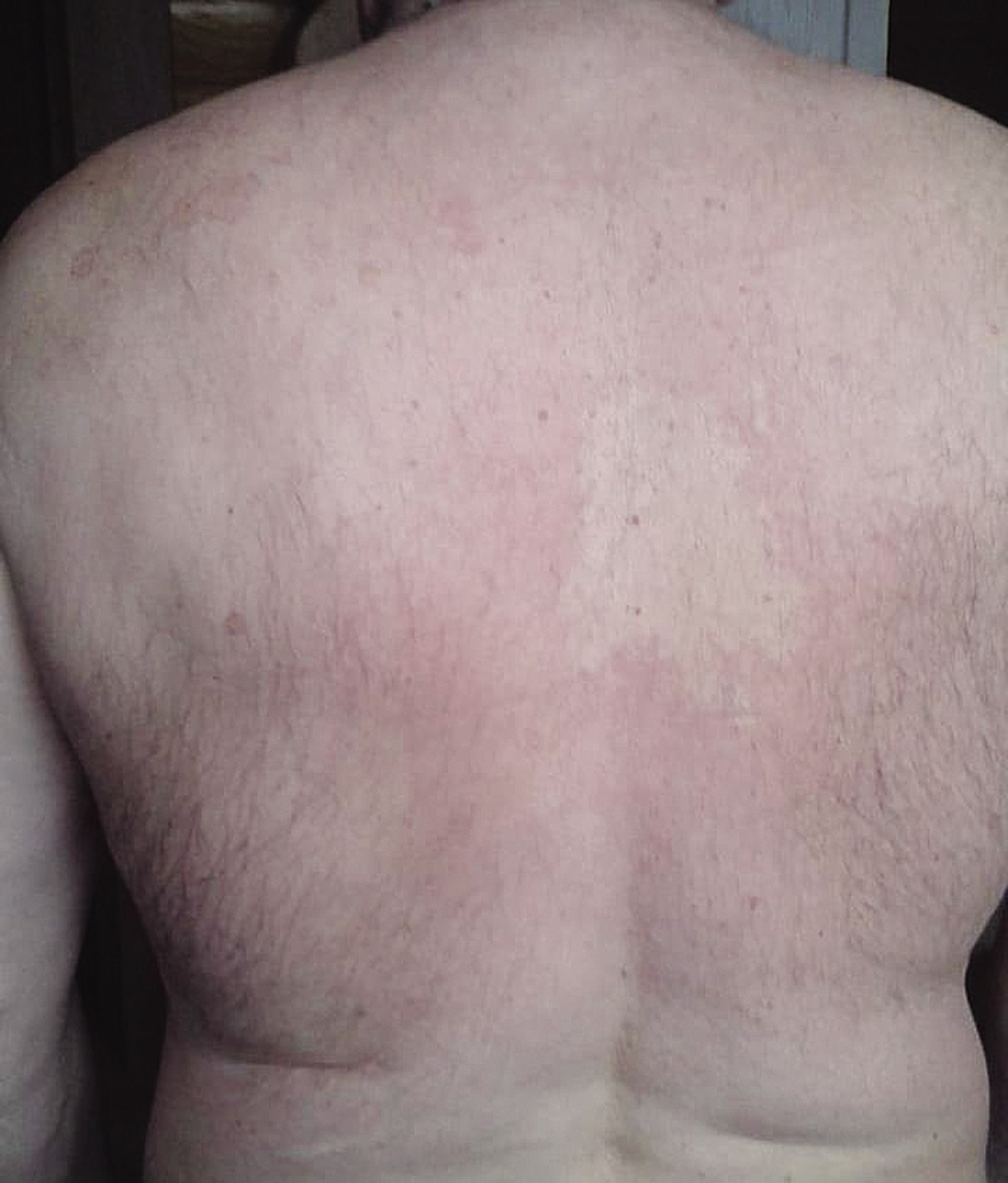 Рис. 18. Отёчная эритема на коже спины у пациента в возрасте 60 лет с COVID-19.