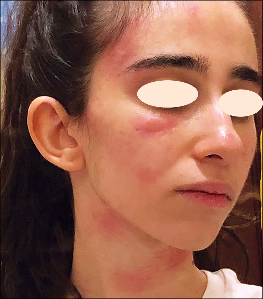 Рис. 19. Волдыри на коже лица и на шее по типу крапивницы у пациентки в возрасте 21 года с COVID-19.